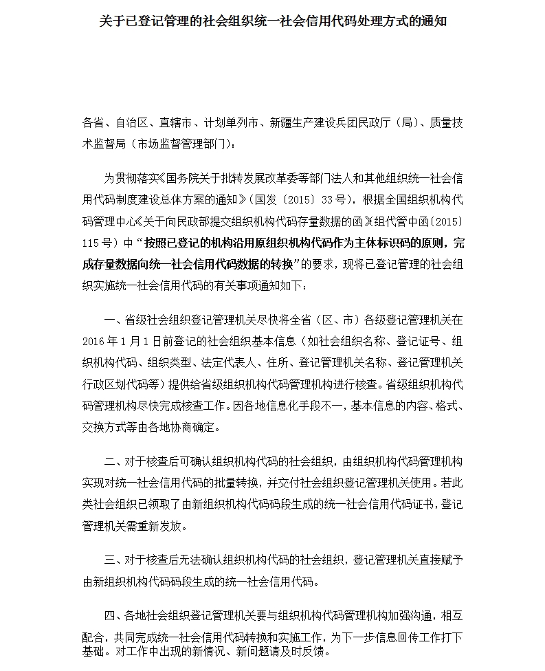 關(guān)于已登記管理的社會組織統(tǒng)一社會信用代碼處理方式的通知