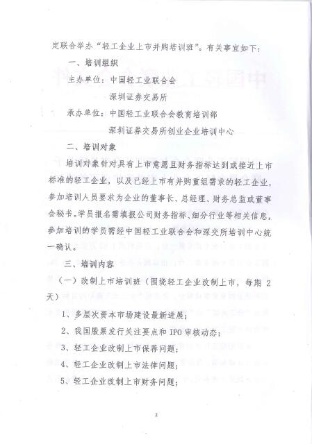 中國(guó)輕工業(yè)聯(lián)合會(huì)與深圳證券交易所關(guān)于聯(lián)合舉辦輕工企業(yè)上市并購(gòu)培訓(xùn)班的通知