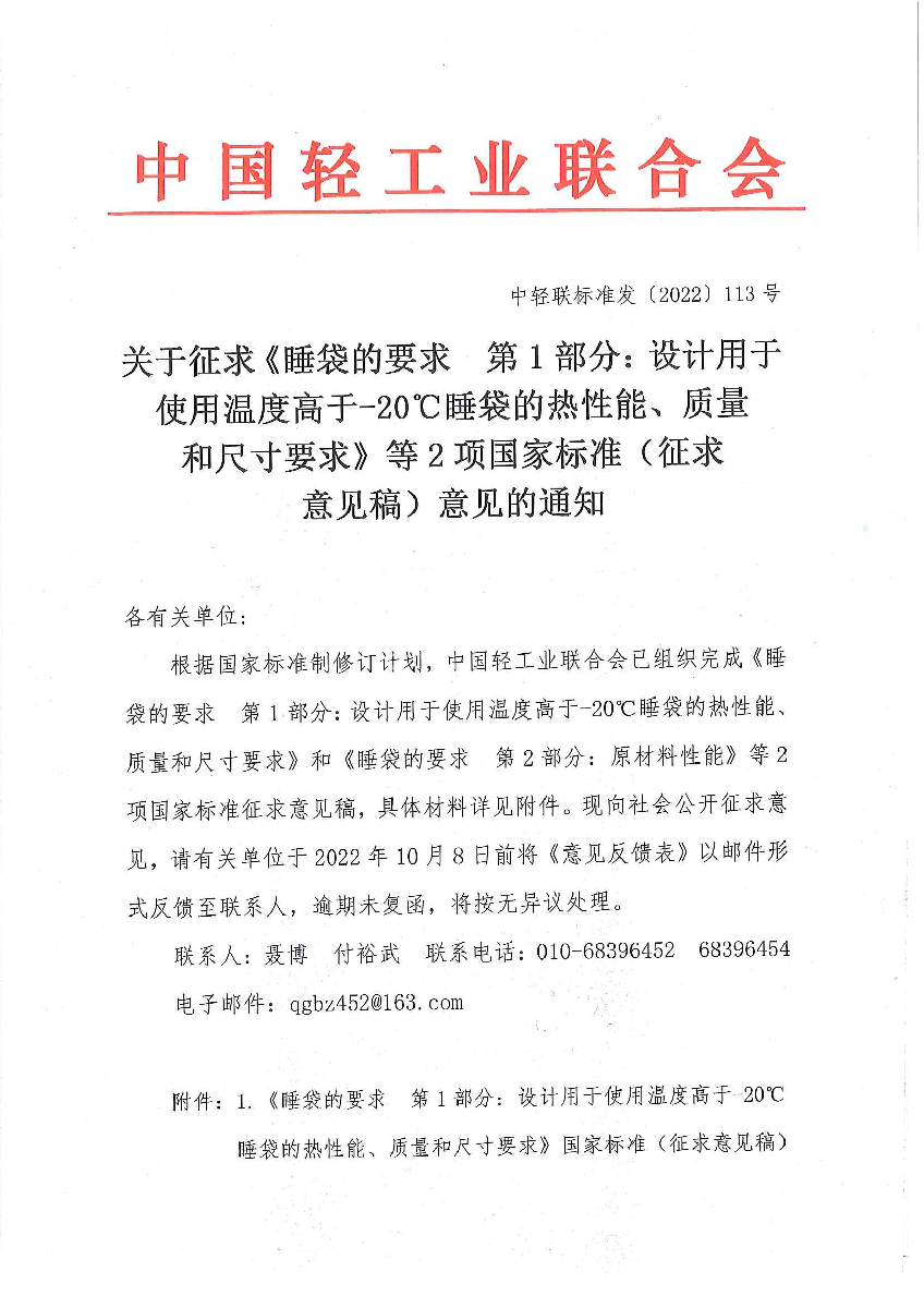 關(guān)于征求《睡袋的要求 第1部分:設(shè)計用于使用溫度高于-20℃睡袋的熱性能、質(zhì)量和尺寸要求》等2項國家標(biāo)準(zhǔn)(征求意見稿)的通知