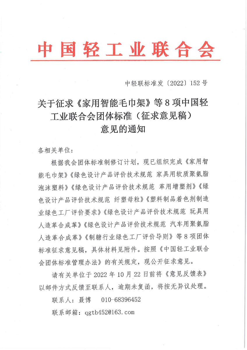 關于征求《家用智能毛巾架》等8項中國輕工業(yè)聯(lián)合會團體標準(征求意見稿)意見的通知