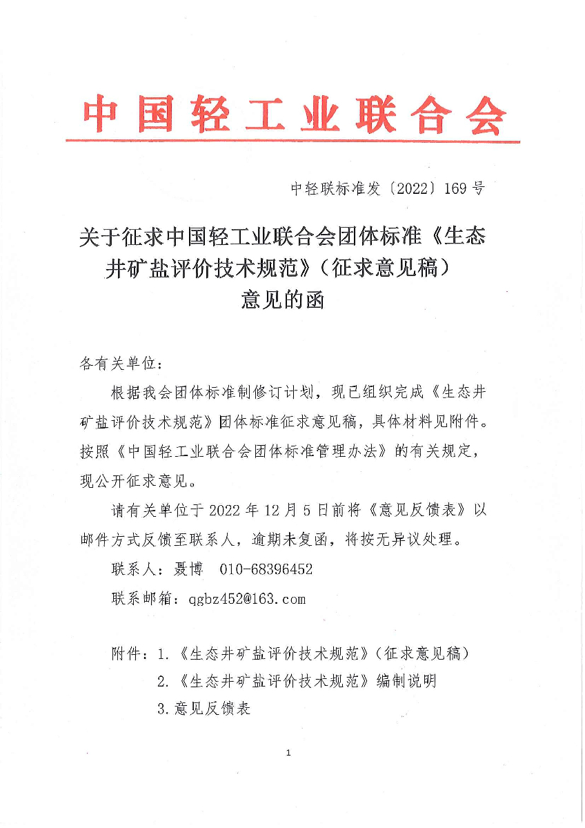 關(guān)于征求中國(guó)輕工業(yè)聯(lián)合會(huì)團(tuán)體標(biāo)準(zhǔn)《生態(tài)井礦鹽評(píng)價(jià)技術(shù)規(guī)范》(征求意見稿)意見的函