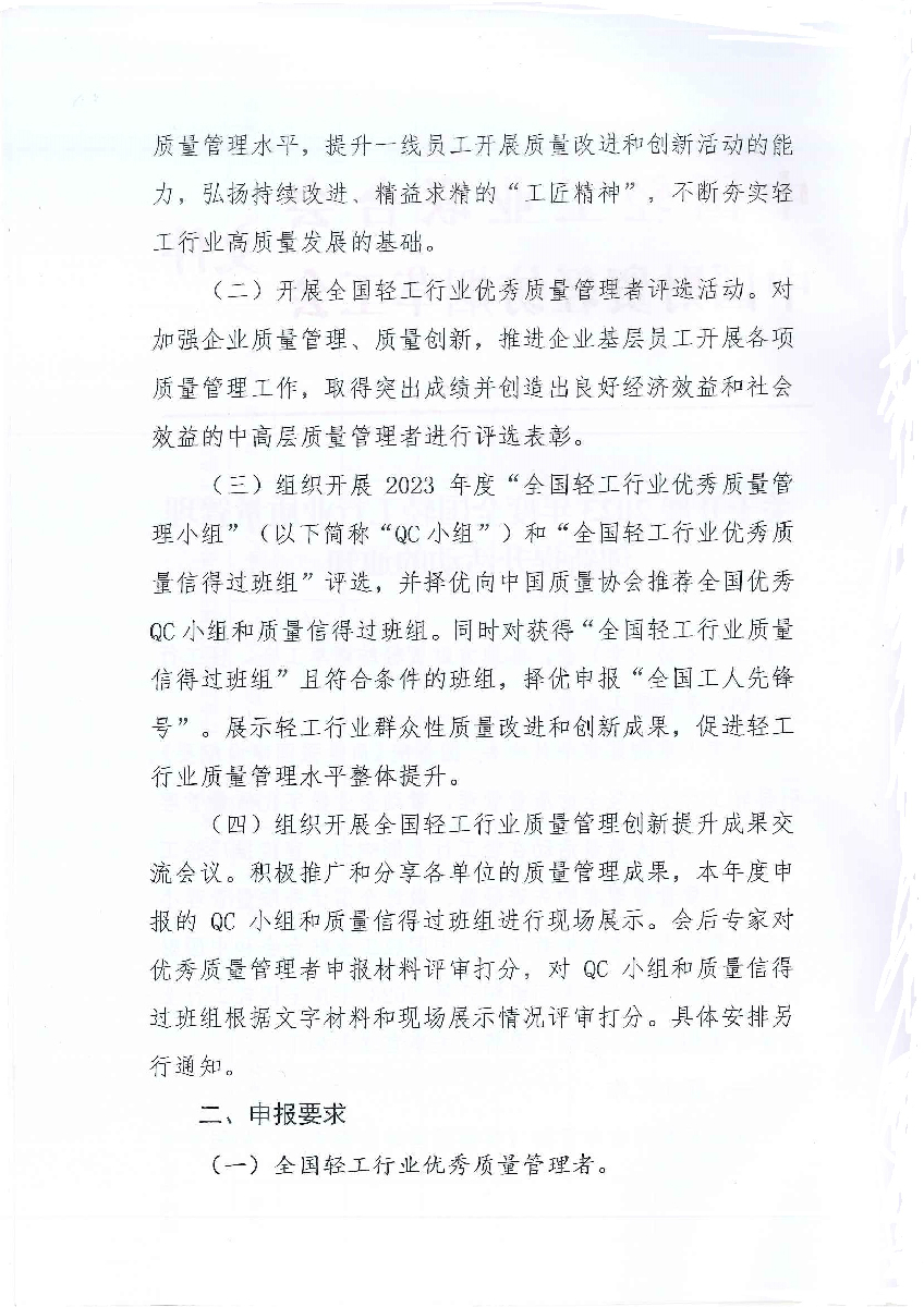 關(guān)于開展2023年度全國輕工行業(yè)質(zhì)量管理創(chuàng)新提升活動的通知