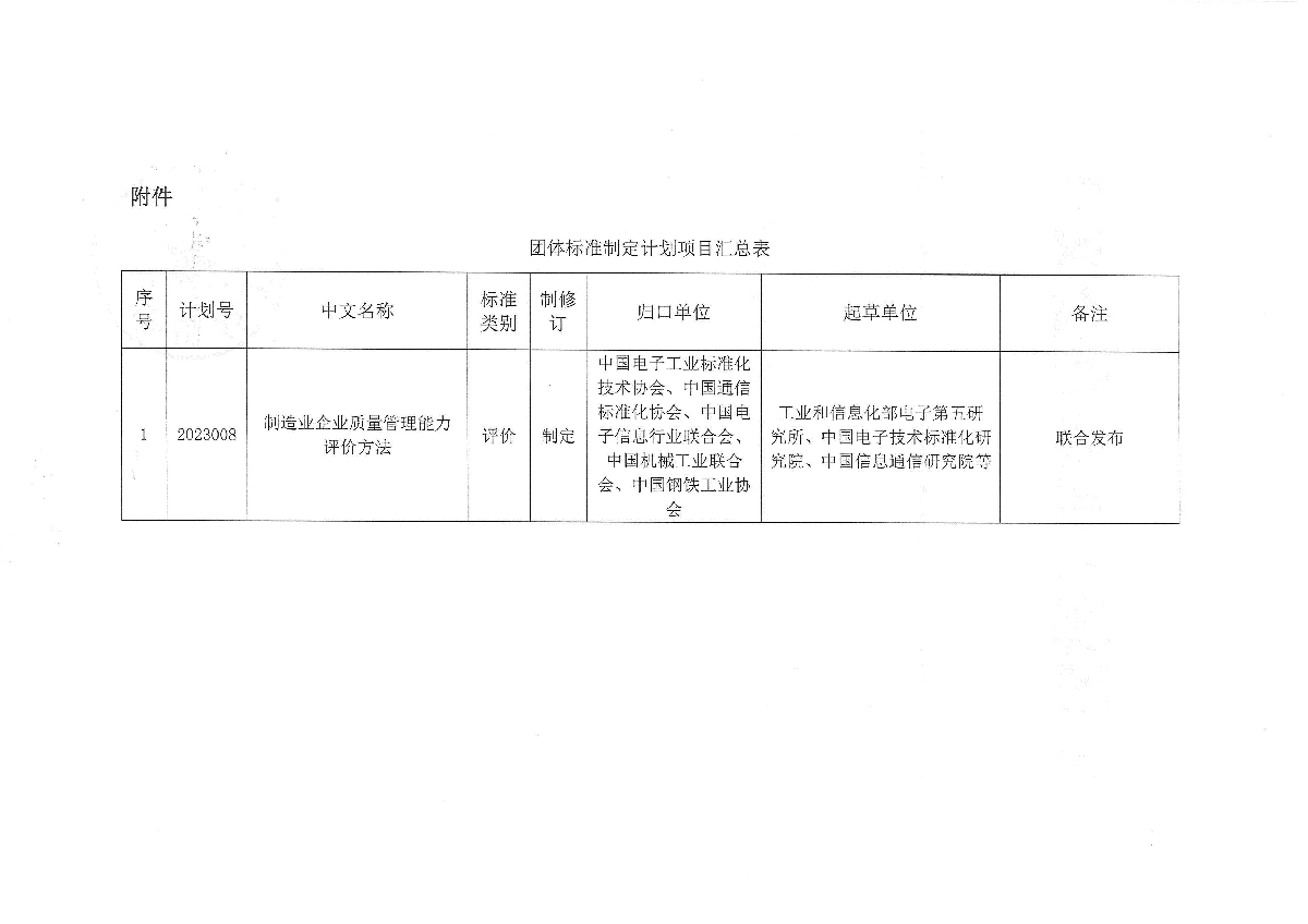 關于下達《制造業(yè)企業(yè)質量管理能力評價方法》中國輕工業(yè)聯(lián)合會團體標準計劃的通知