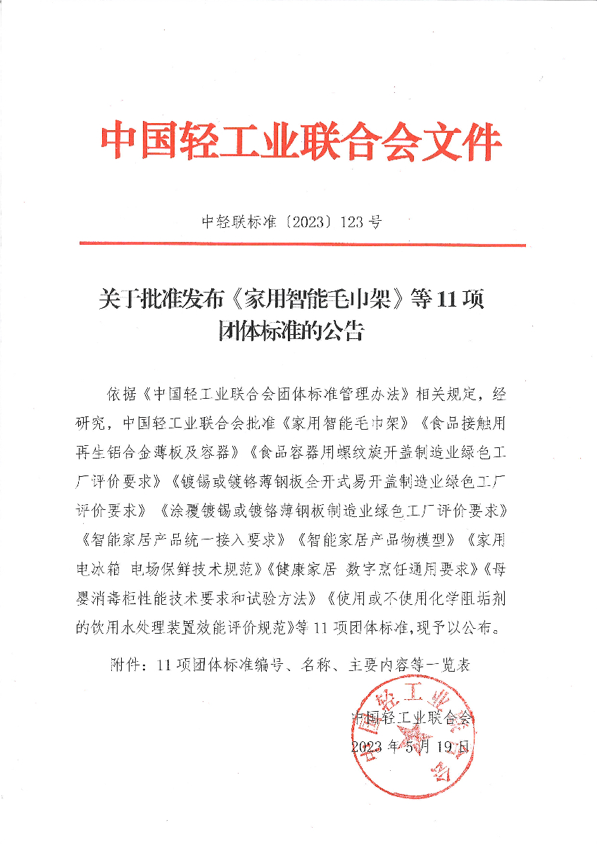 關(guān)于批準(zhǔn)發(fā)布《家用智能毛巾架》等11項(xiàng)團(tuán)體標(biāo)準(zhǔn)的公告