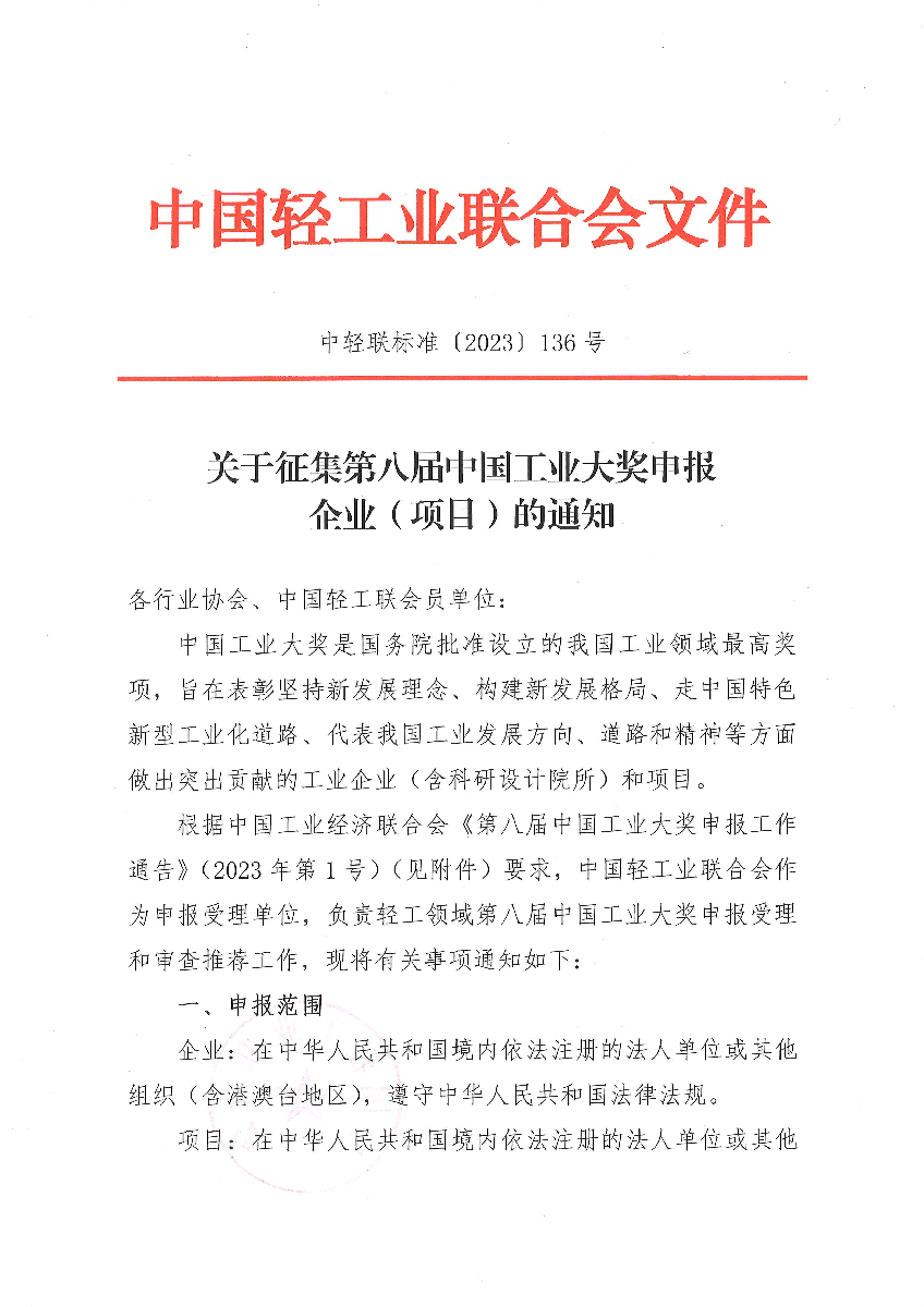 第八屆中國工業(yè)大獎申報工作通告(2023年第1號)