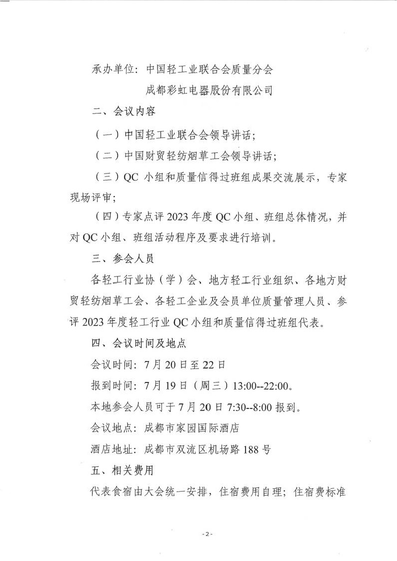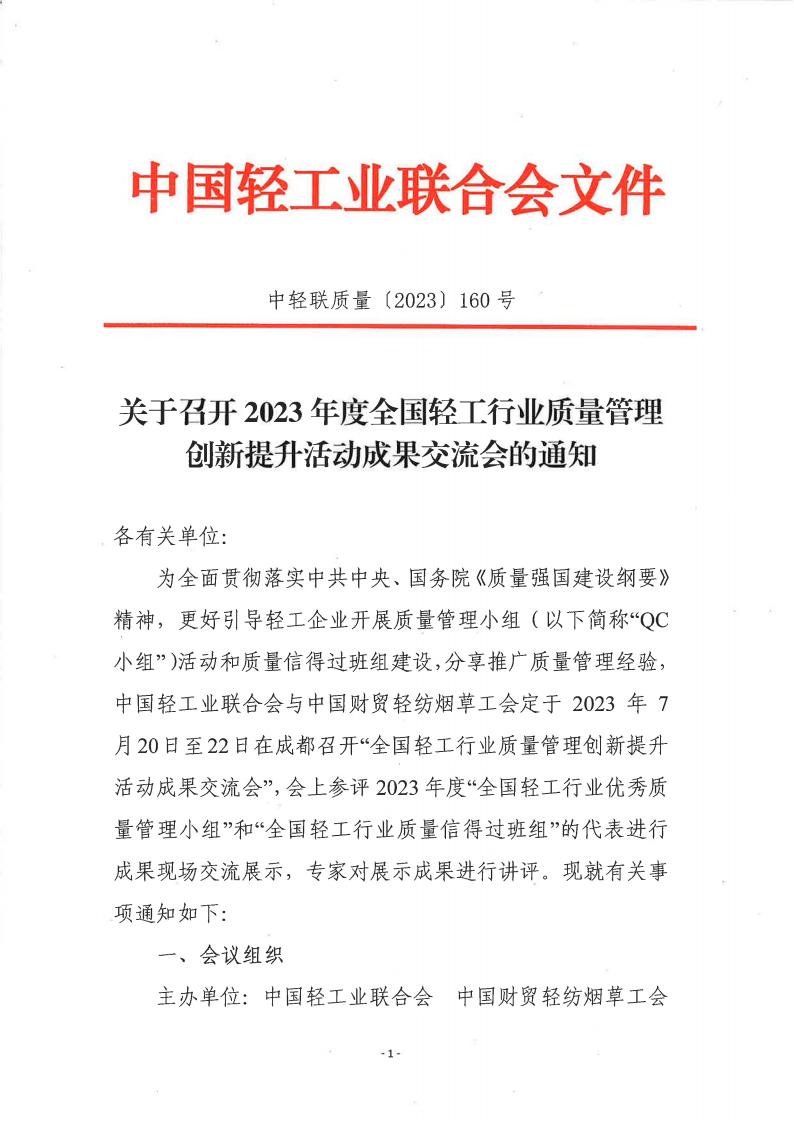 關(guān)于召開2023年度全國(guó)輕工行業(yè)質(zhì)量管理創(chuàng)新提升活動(dòng)成果交流會(huì)的通知