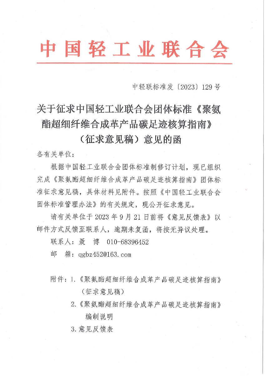 關(guān)于征求中國(guó)輕工業(yè)聯(lián)合會(huì)團(tuán)體標(biāo)準(zhǔn)《聚氨酯超細(xì)纖維合成革產(chǎn)品碳足跡核算指南》(征求意見(jiàn)稿)意見(jiàn)的函