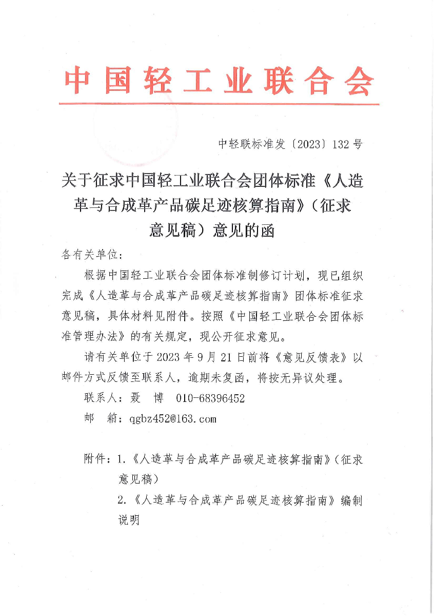 關(guān)于征求中國輕工業(yè)聯(lián)合會團(tuán)體標(biāo)準(zhǔn)《人造革與合成革產(chǎn)品碳足跡核算指南》(征求意見稿)意見的函