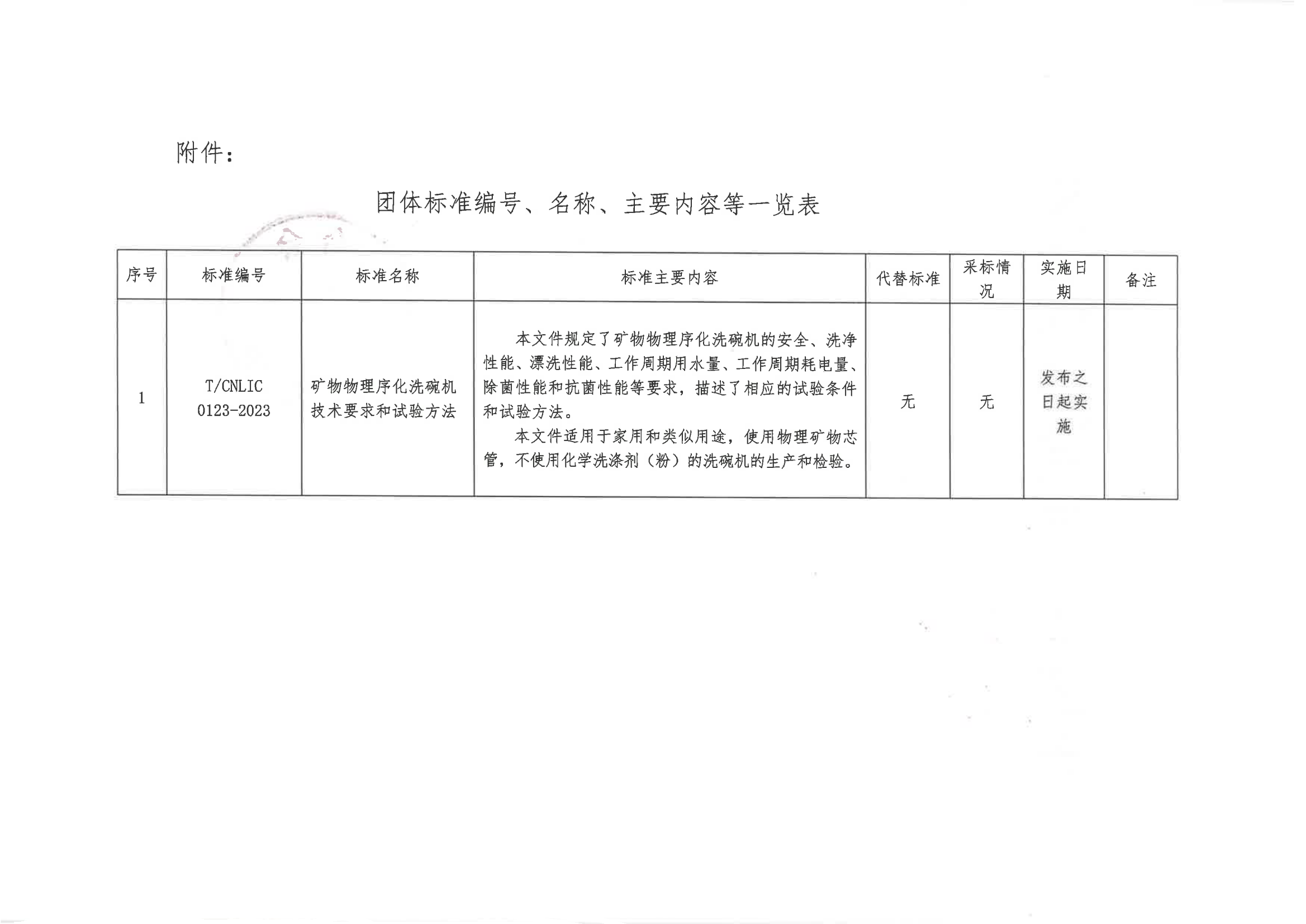 關(guān)于批準(zhǔn)發(fā)布《礦物物理序化洗碗機技術(shù)要求和試驗方法》團體標(biāo)準(zhǔn)的公告