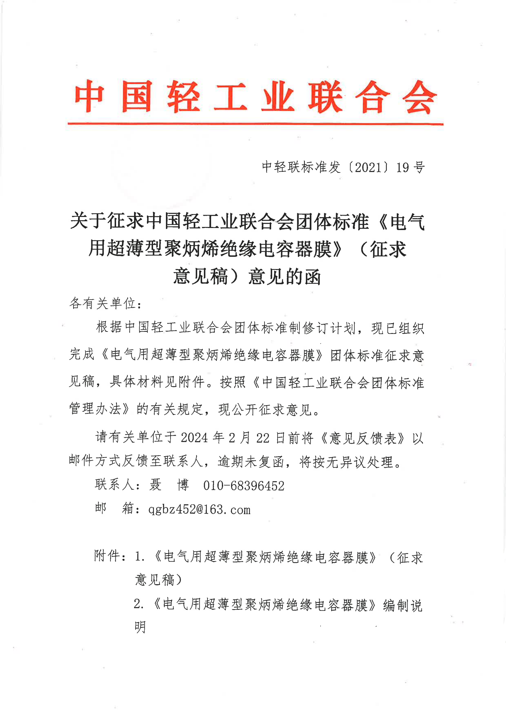 關(guān)于征求中國(guó)輕工業(yè)聯(lián)合會(huì)團(tuán)體標(biāo)準(zhǔn)《電氣用超薄型聚丙烯絕緣電容器膜》(征求意見(jiàn)稿)意見(jiàn)的函