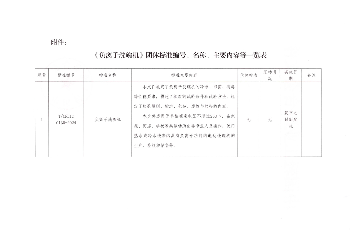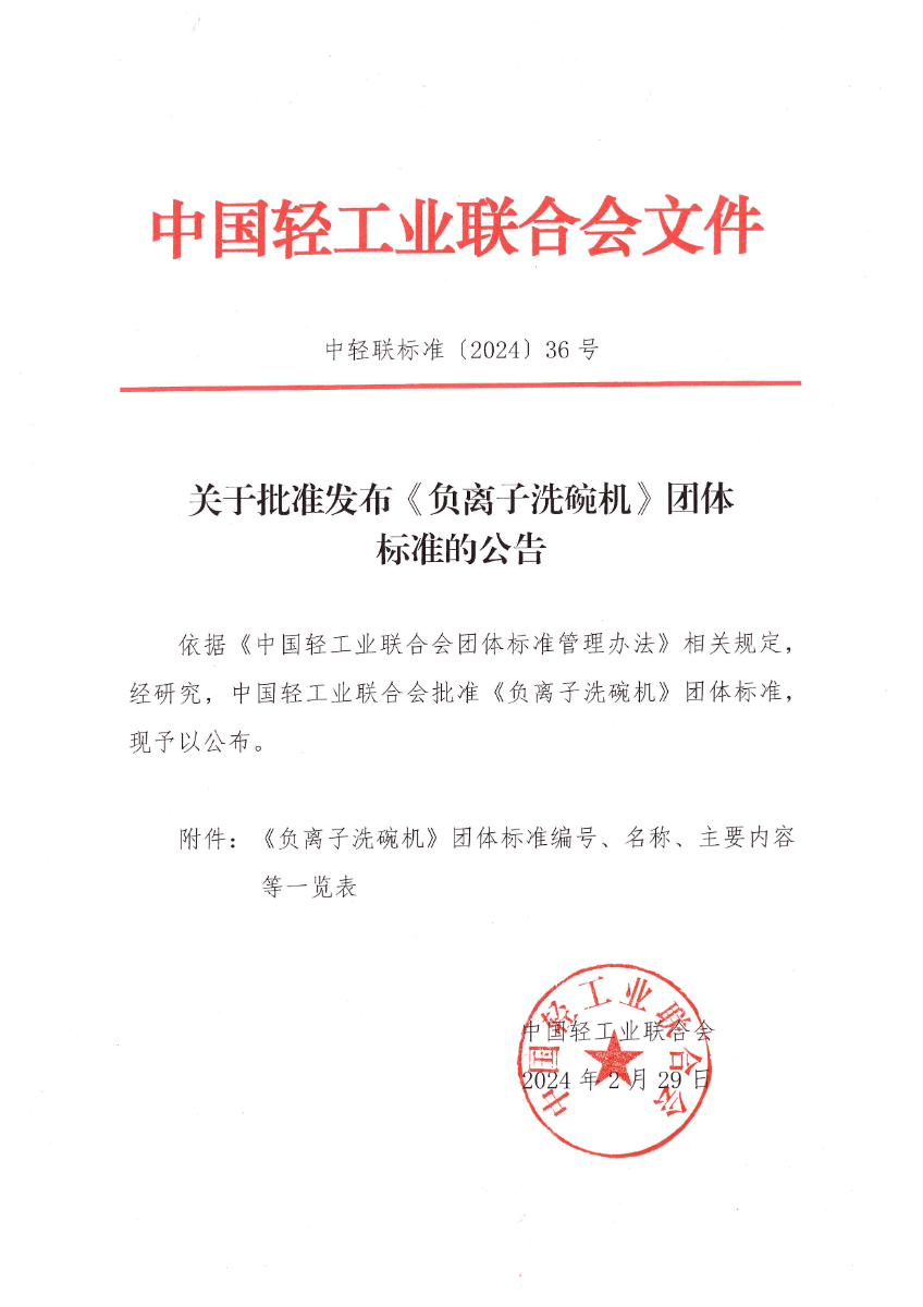 關(guān)于批準(zhǔn)發(fā)布《負(fù)離子洗碗機(jī)》團(tuán)體標(biāo)準(zhǔn)的公告