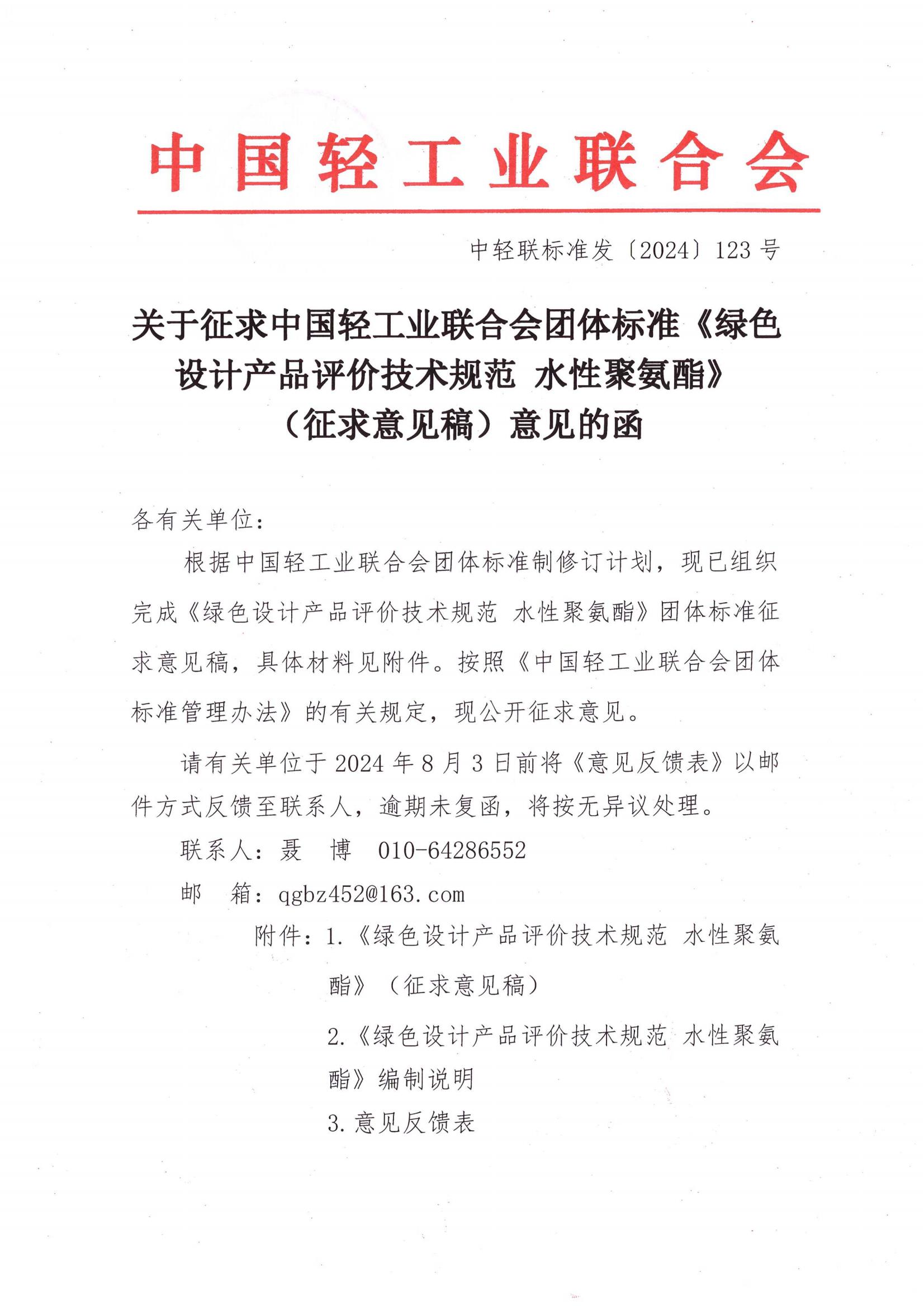 關(guān)于征求中國(guó)輕工業(yè)聯(lián)合會(huì)團(tuán)體標(biāo)準(zhǔn)《綠色設(shè)計(jì)產(chǎn)品評(píng)價(jià)技術(shù)規(guī)范 水性聚氨酯》(征求意見稿)意見的函