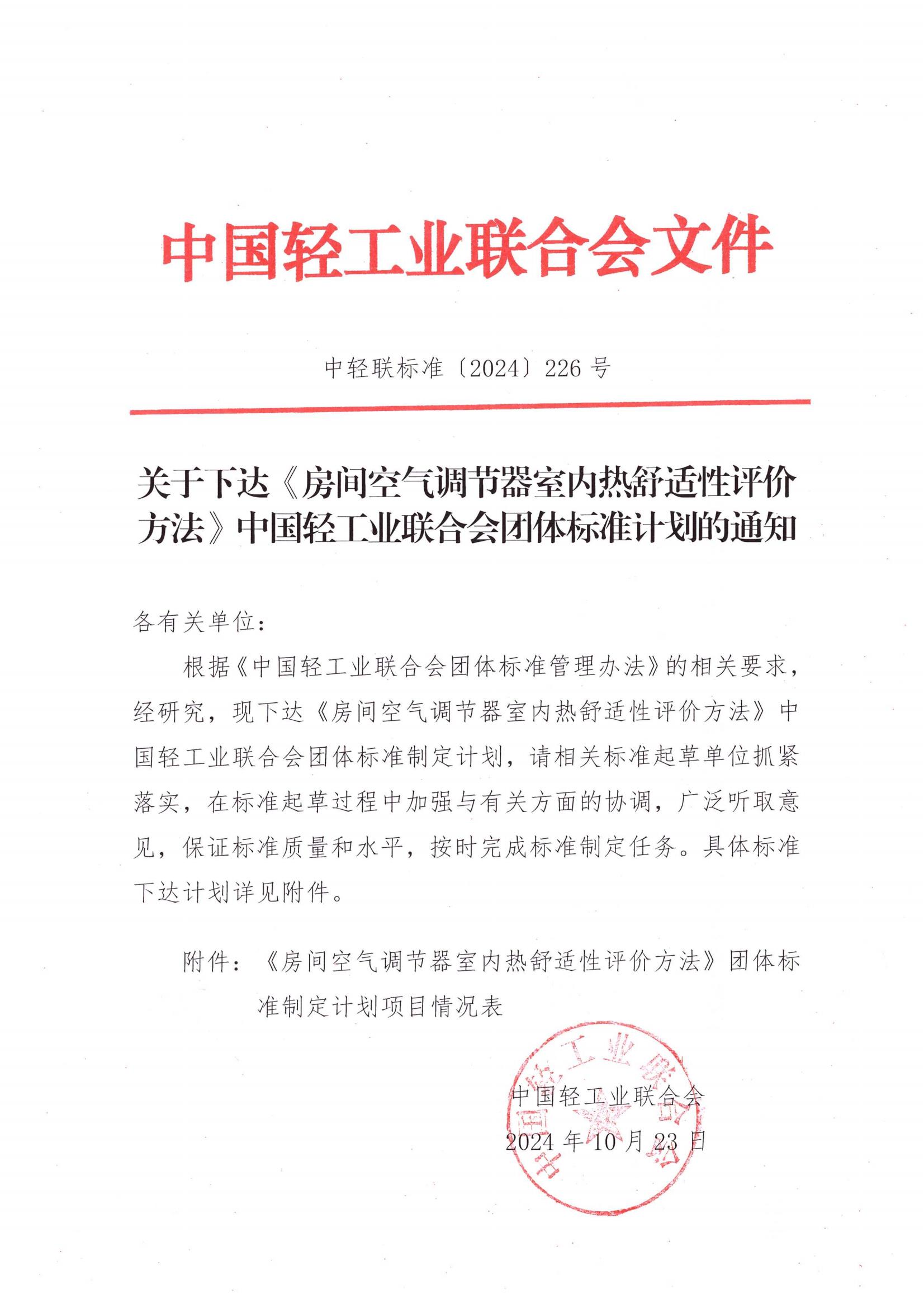 關(guān)于下達(dá)《房間空氣調(diào)節(jié)器室內(nèi)熱舒適性評價(jià)方法》中國輕工業(yè)聯(lián)合會團(tuán)體標(biāo)準(zhǔn)計(jì)劃的通知