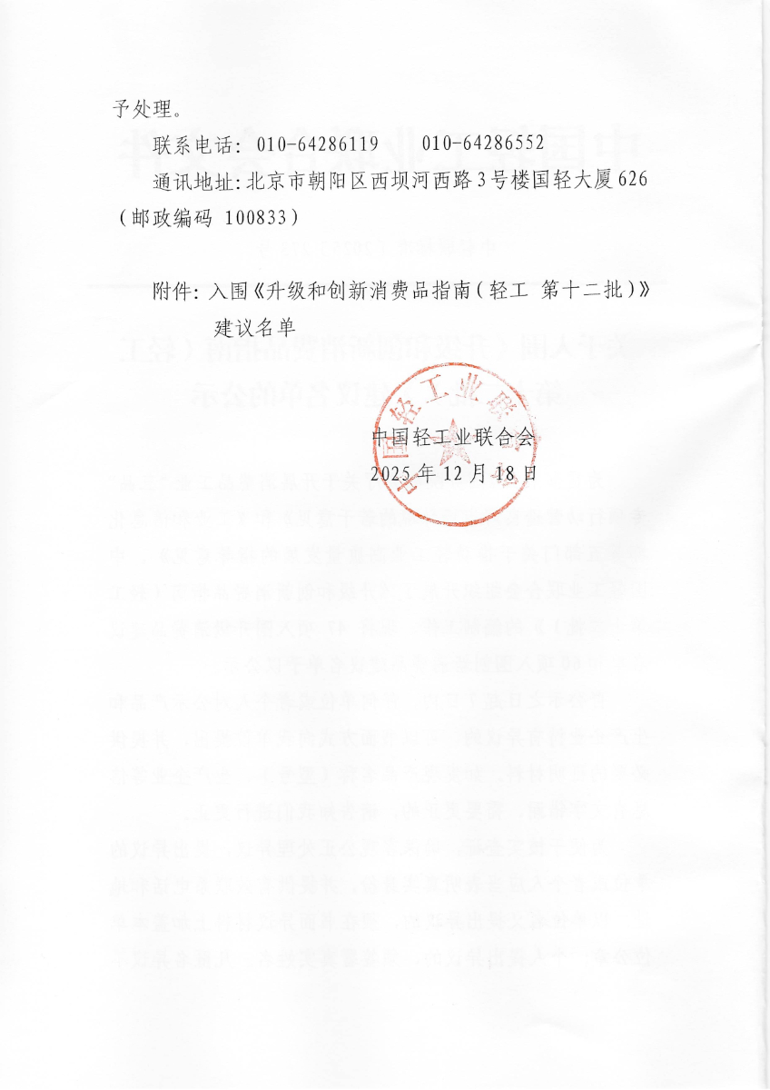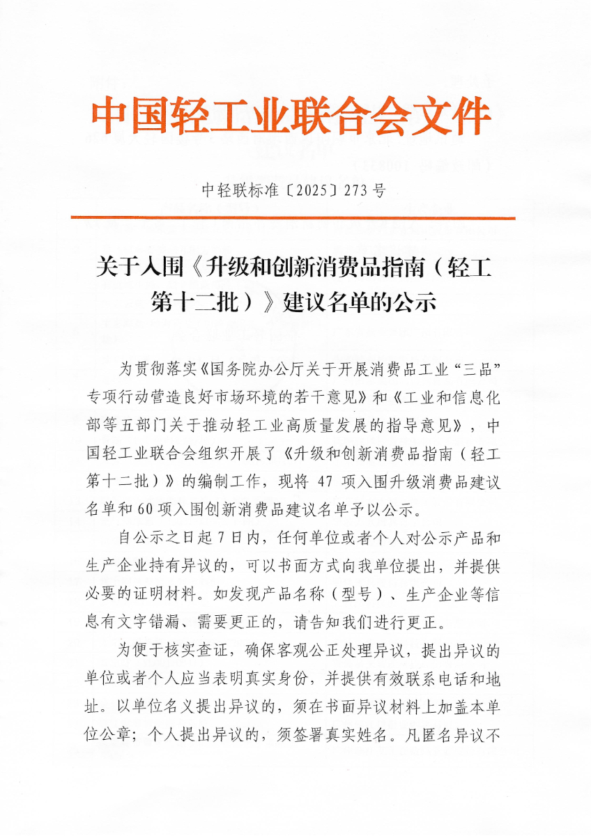 關(guān)于入圍《升級和創(chuàng)新消費品指南(輕工 第十二批)》建議名單的公示