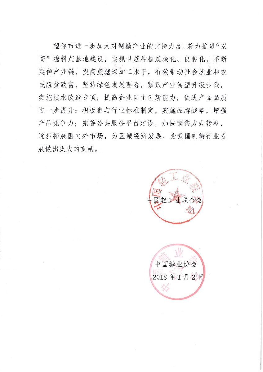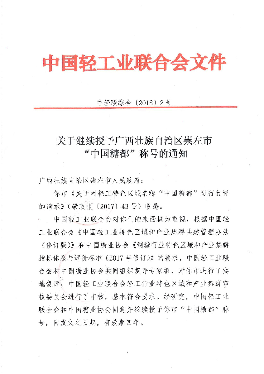 關(guān)于繼續(xù)授予廣西壯族自治區(qū)崇左市“中國糖都”稱號的通知