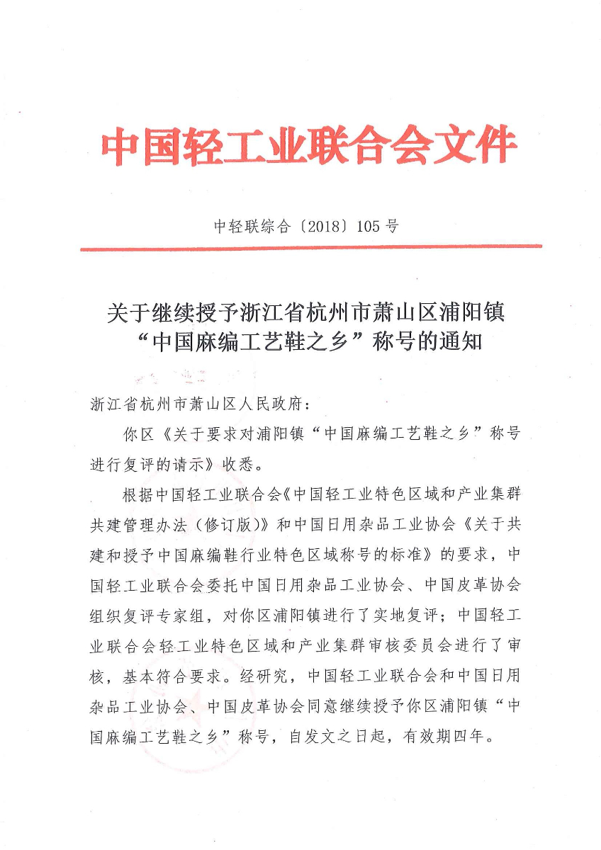 關(guān)于繼續(xù)授予浙江省杭州市蕭山區(qū)浦陽鎮(zhèn)“中國麻編工藝鞋之鄉(xiāng)”稱號的通知