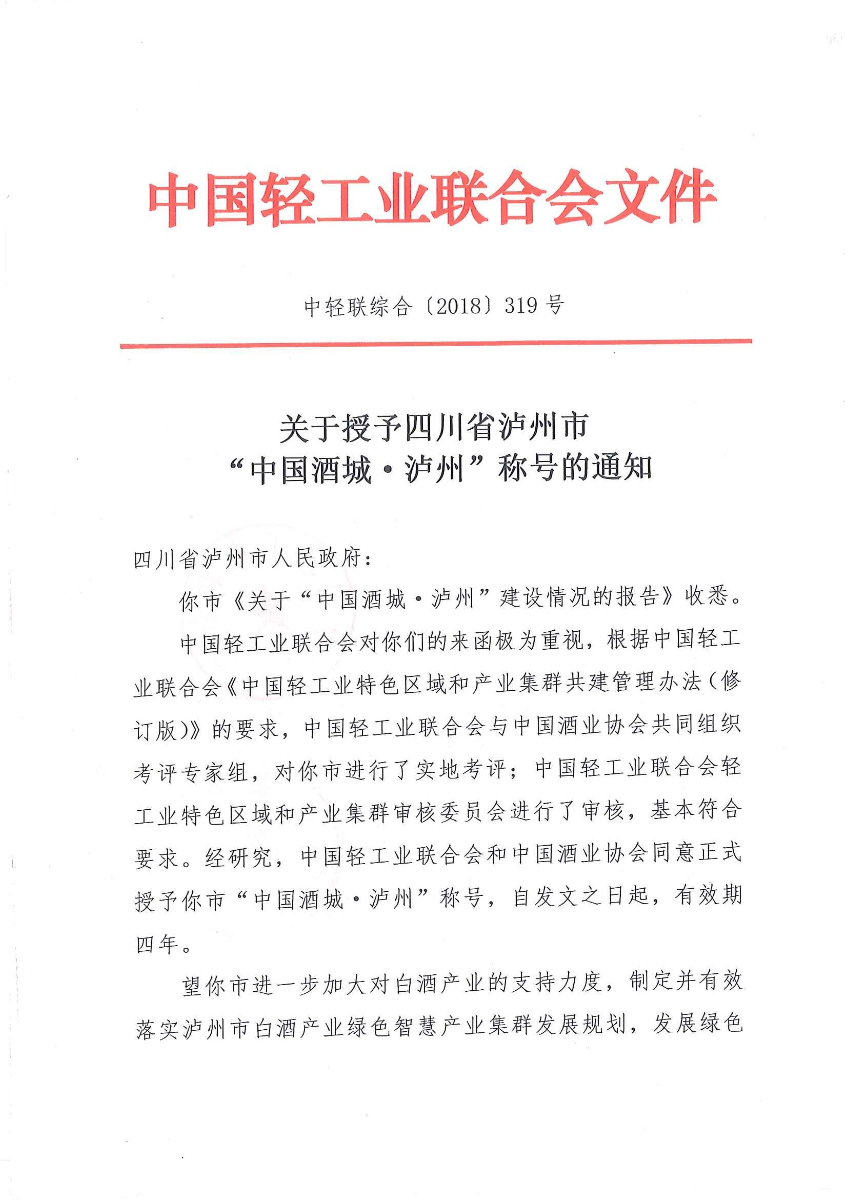 關(guān)于授予四川省瀘州市“中國(guó)酒城·瀘州”稱號(hào)的通知