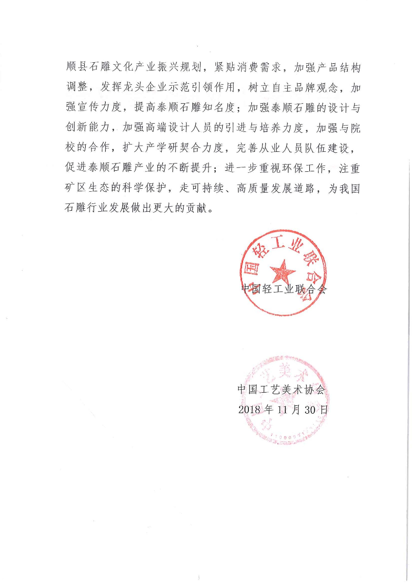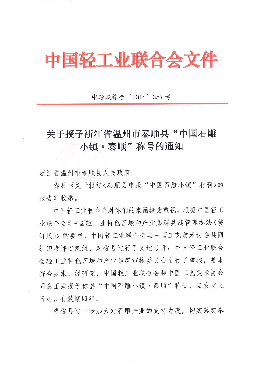 關(guān)于授予浙江省溫州市泰順縣“中國石雕小鎮(zhèn)·泰順”稱號(hào)的通知