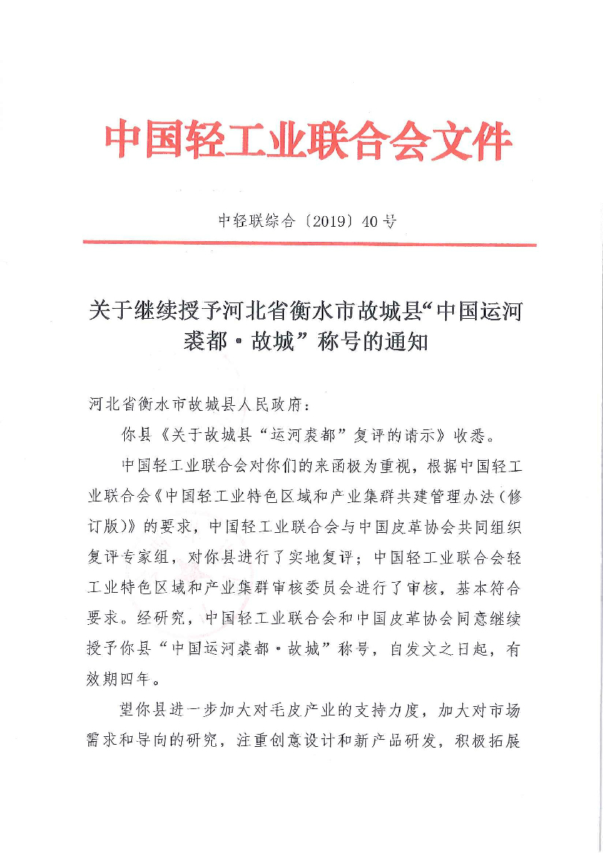 關(guān)于繼續(xù)授予河北省衡水市故城縣"中國運河裘都·故城"稱號的通知