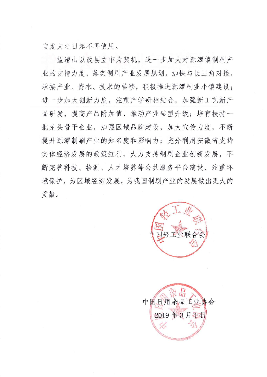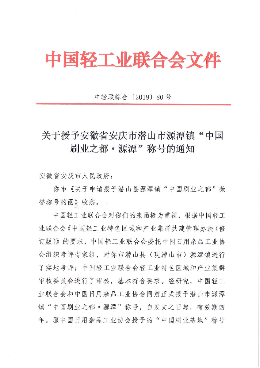 關(guān)于授予安徽省安慶市潛山市源潭鎮(zhèn)"中國刷業(yè)之都·源潭"稱號的通知