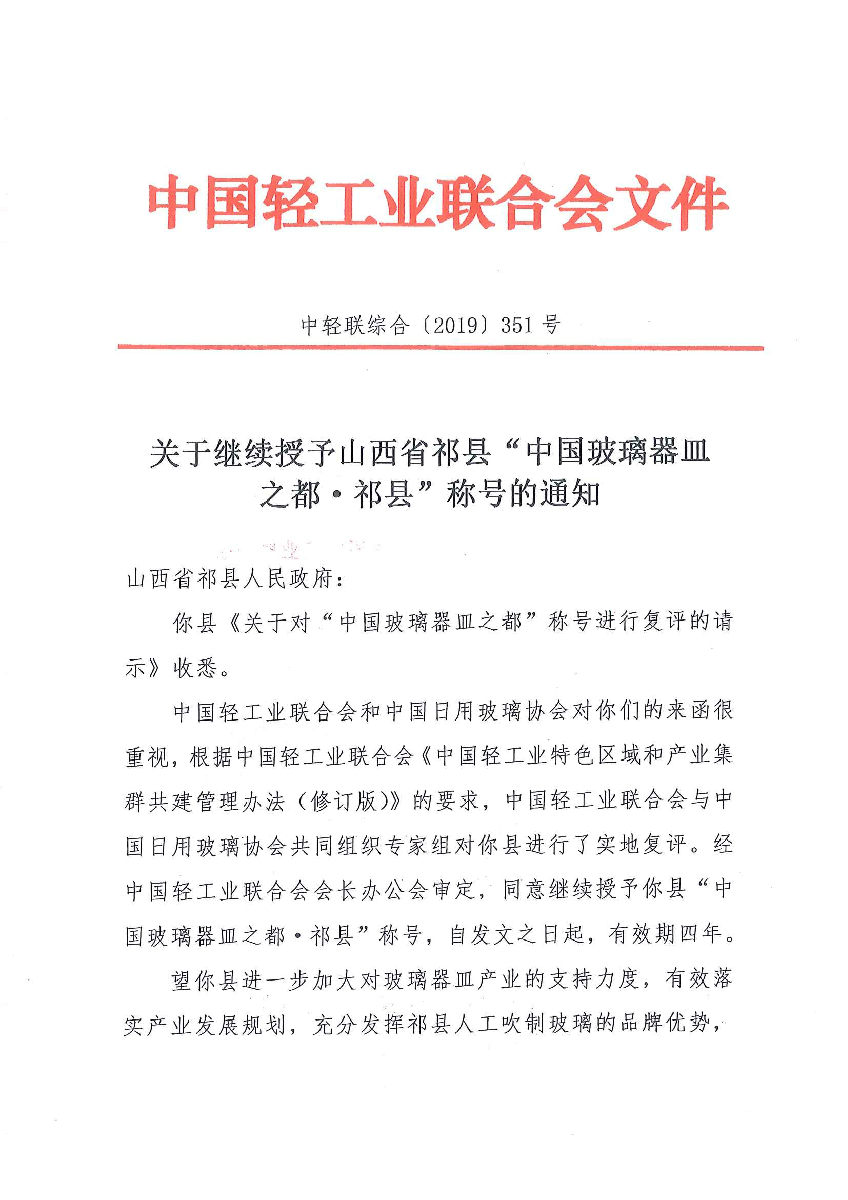 關(guān)于繼續(xù)授予山西省祁縣“中國玻璃器皿之都·祁縣”稱號的通知