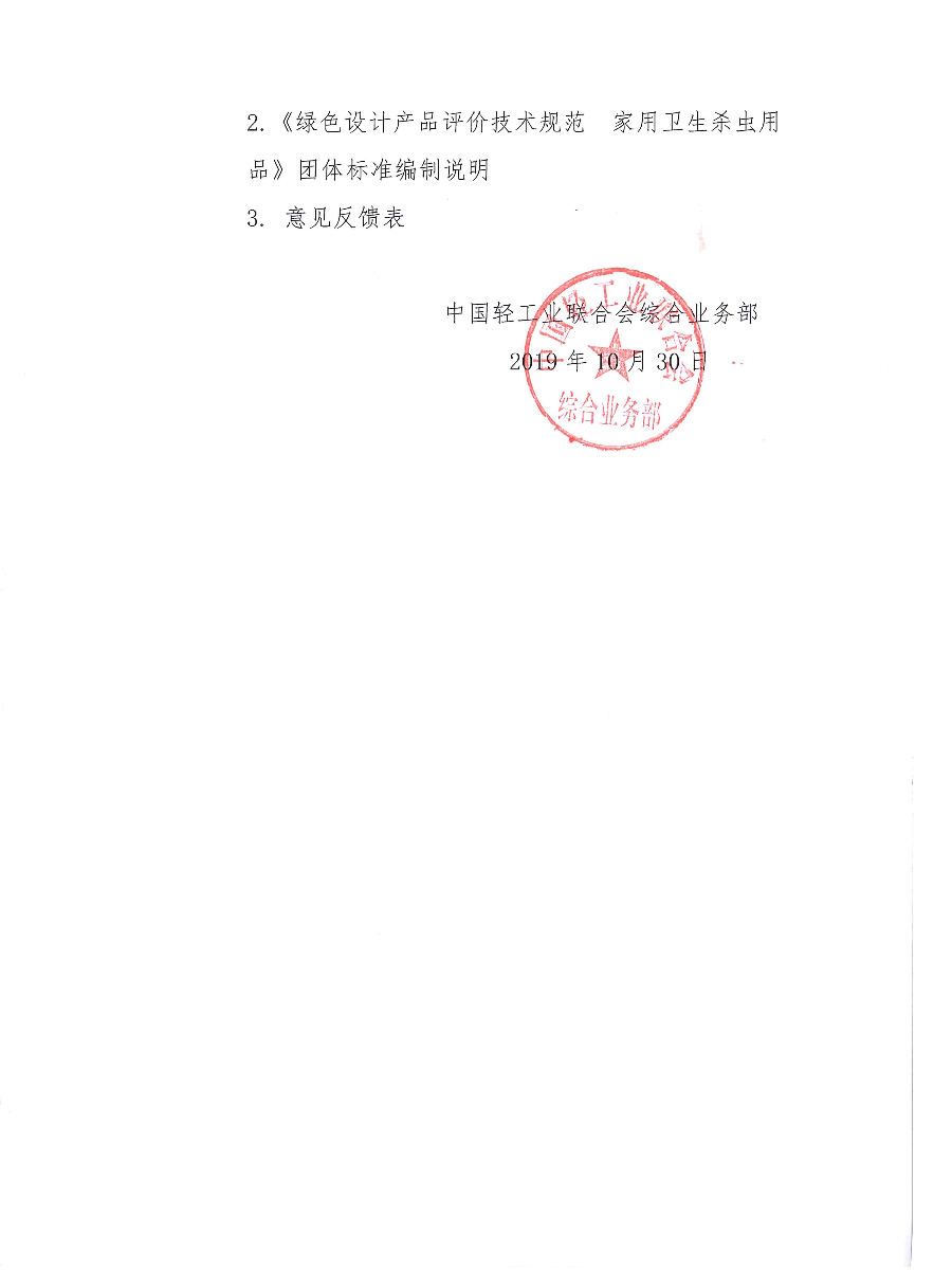 關于征求《綠色設計產(chǎn)品評價技術規(guī)范 家用衛(wèi)生殺蟲用品》中國輕工業(yè)聯(lián)合會團體標準(征求意見稿)意見的通知