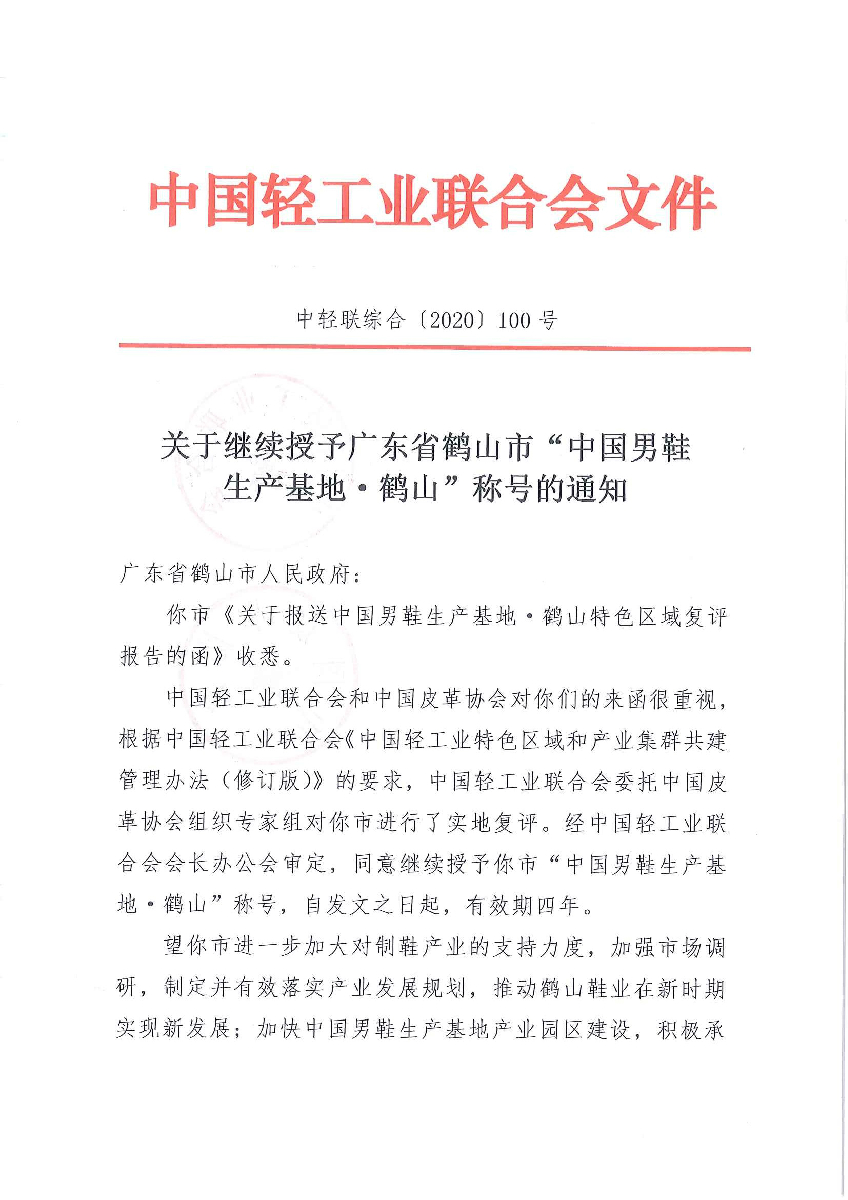 關于繼續(xù)授予廣東省鶴山市“中國男鞋生產基地·鶴山”稱號的通知