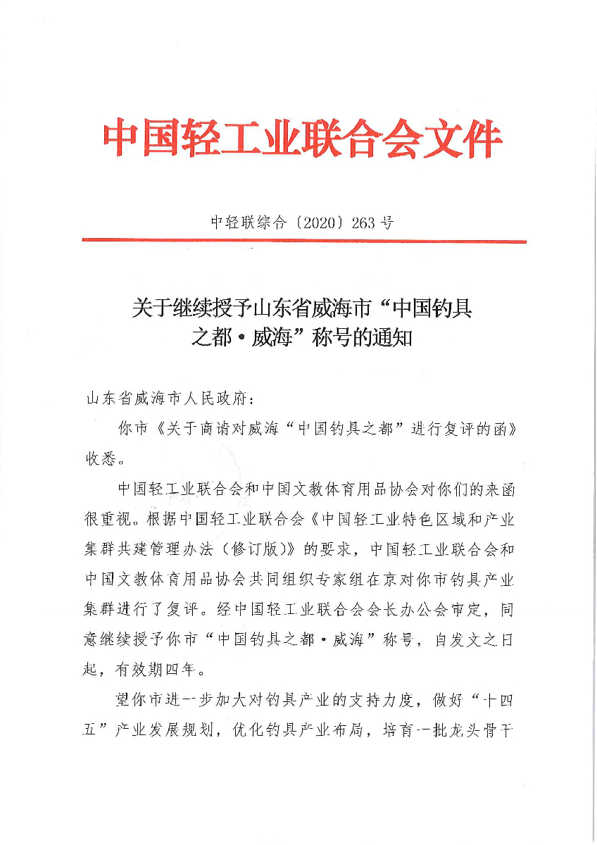 關(guān)于繼續(xù)授予山東省威海市“中國(guó)釣具之都·威海”稱號(hào)的通知