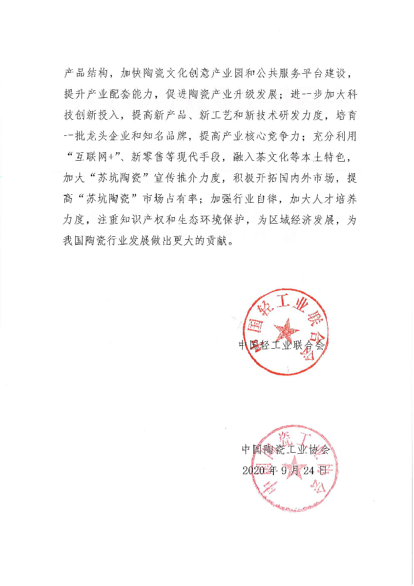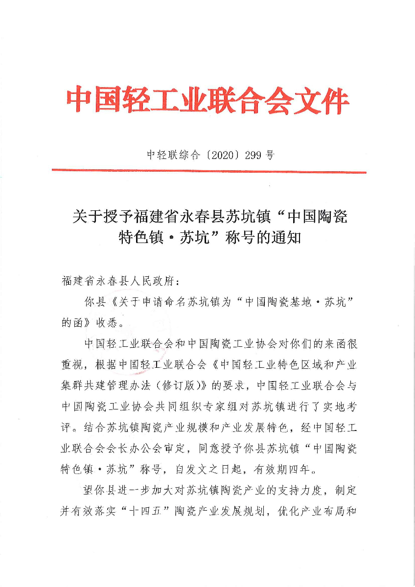 關于授予福建省永春縣蘇坑鎮(zhèn)“中國陶瓷特色鎮(zhèn)·蘇坑”稱號的通知