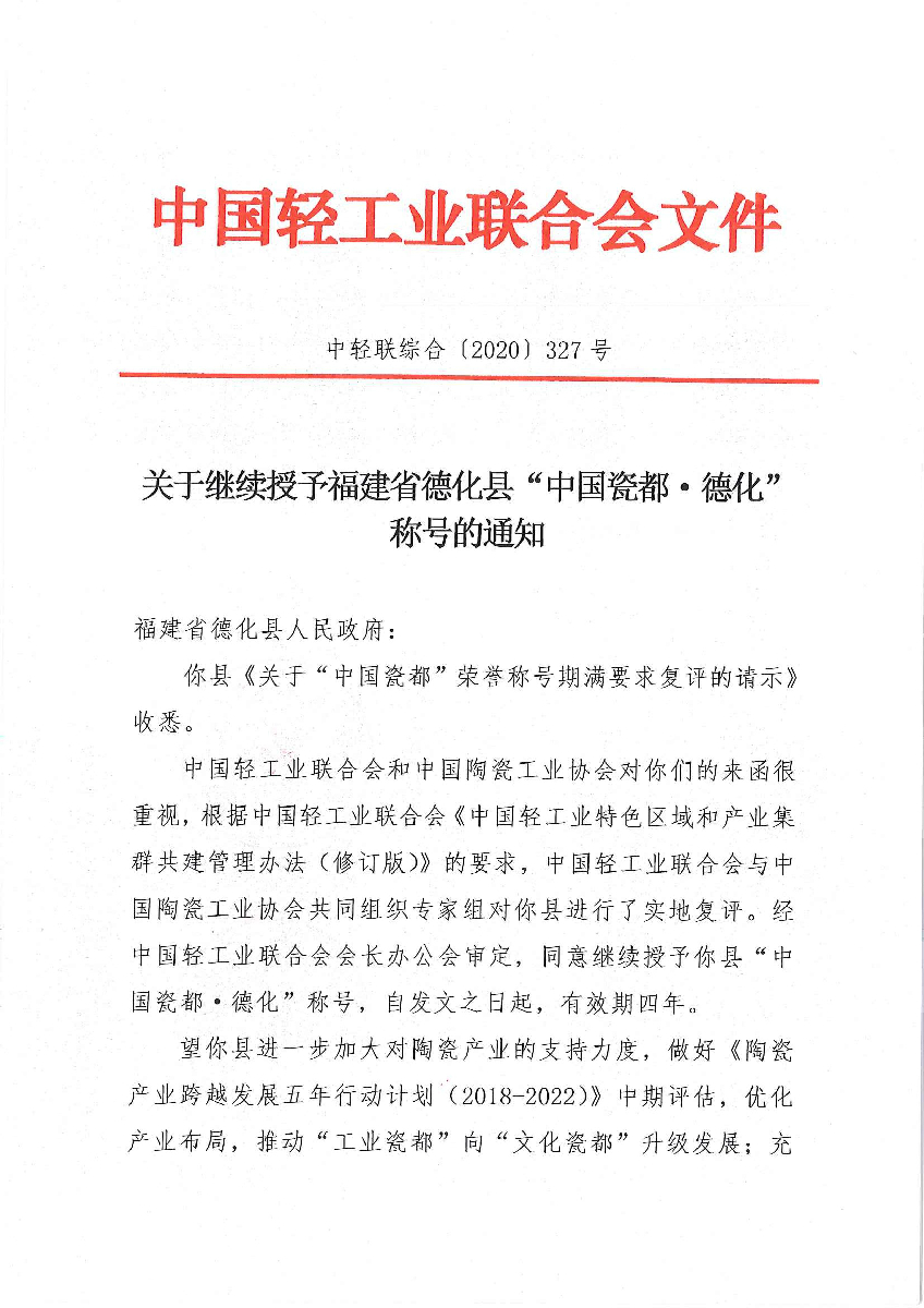關(guān)于繼續(xù)授予福建省德化縣“中國瓷都·德化”稱號的通知