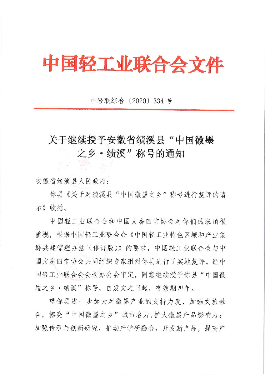 關(guān)于繼續(xù)授予安徽省績溪縣“中國徽墨之鄉(xiāng)·績溪”稱號的通知
