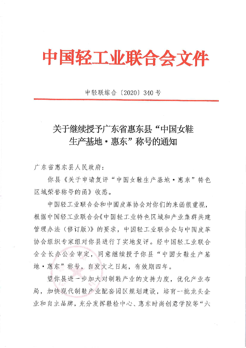 關(guān)于繼續(xù)授予廣東省惠東縣“中國(guó)女鞋生產(chǎn)基地·惠東”稱號(hào)的通知