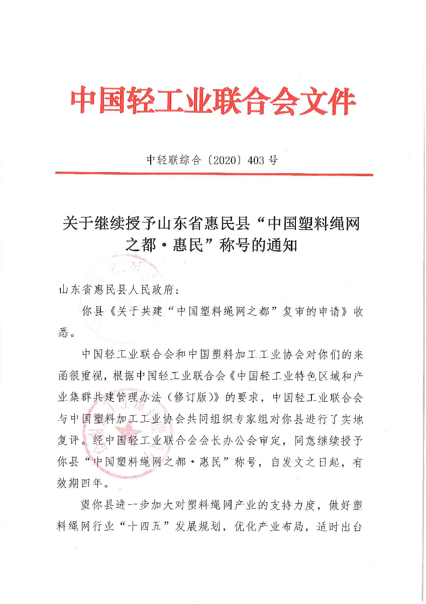 關(guān)于繼續(xù)授予山東省惠民縣“中國塑料繩網(wǎng)之都·惠民”稱號的通知