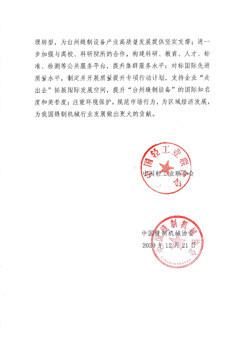 關(guān)于繼續(xù)授予浙江省臺州市“中國縫制設(shè)備制造之都·臺州”稱號的通知