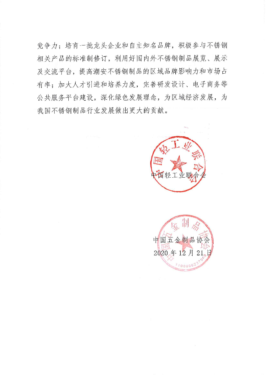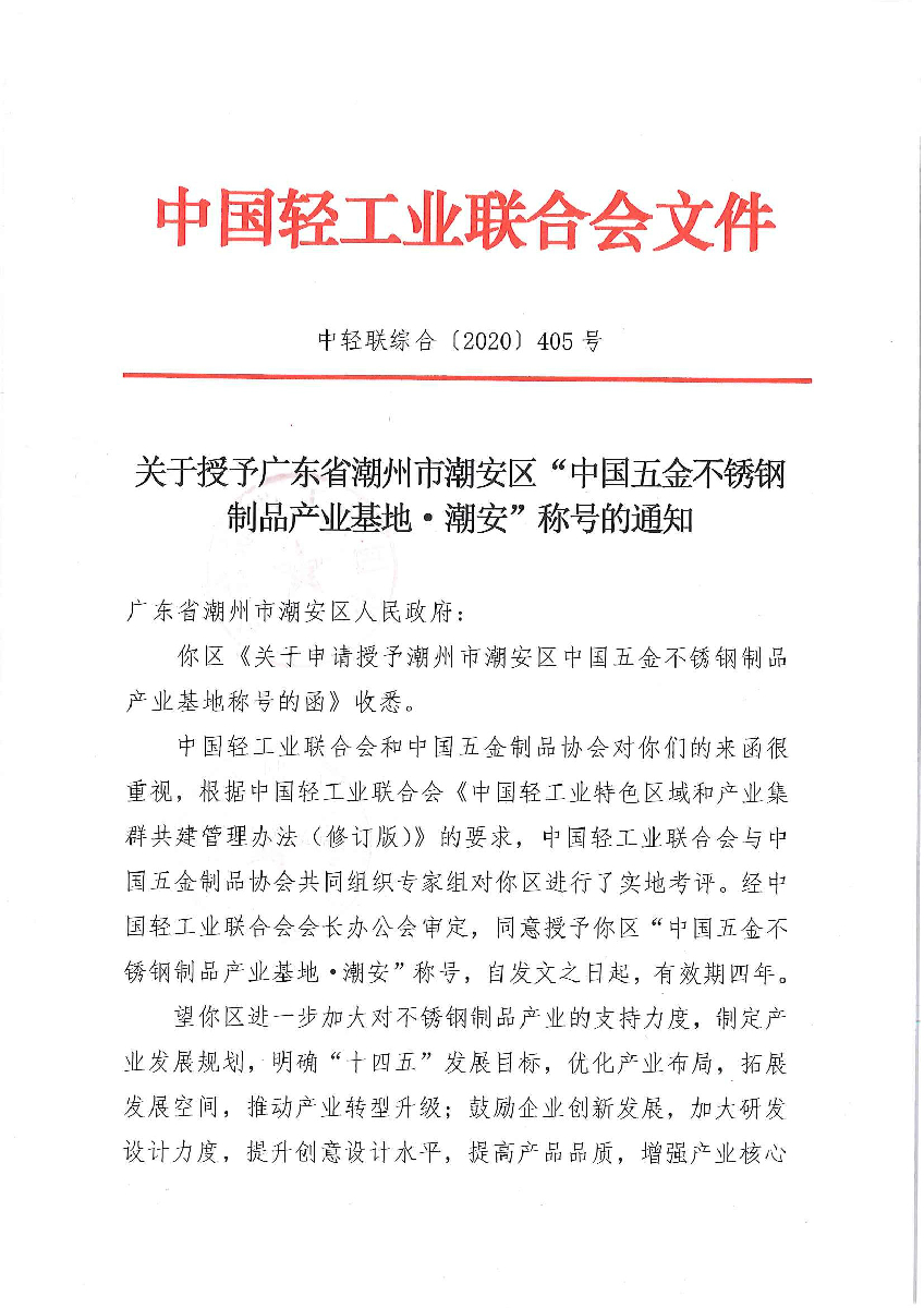 關(guān)于授予廣東省潮州市潮安區(qū)“中國(guó)五金不銹鋼制品產(chǎn)業(yè)基地·潮安”稱號(hào)的通知