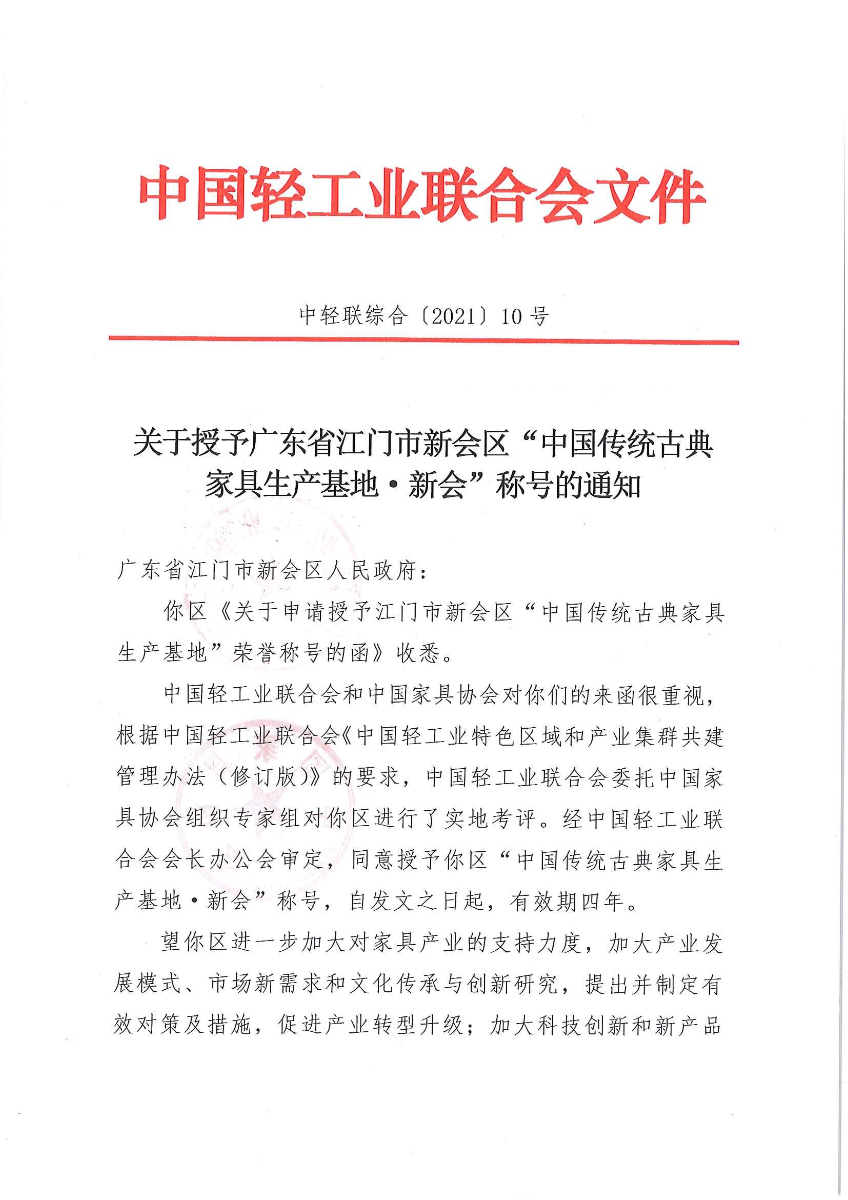 關(guān)于授予廣東省江門市新會區(qū)“中國傳統(tǒng)古典家具生產(chǎn)基地·新會”稱號的通知