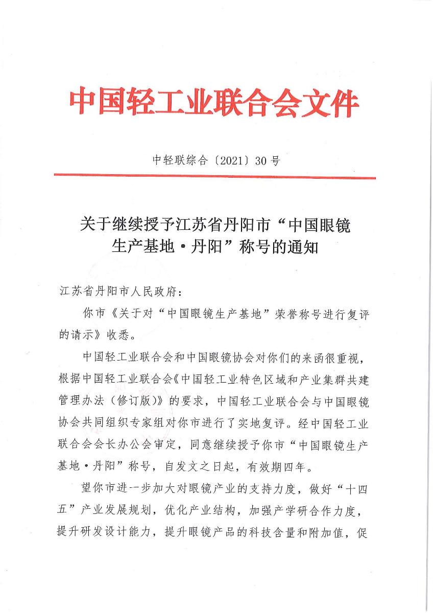 關(guān)于繼續(xù)授予江蘇省丹陽市“中國眼鏡生產(chǎn)基地·丹陽”稱號的通知