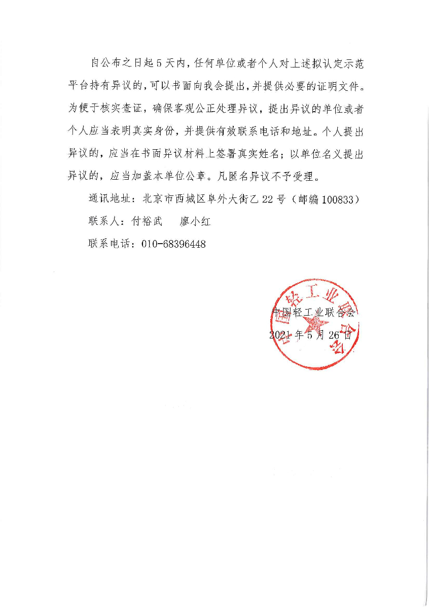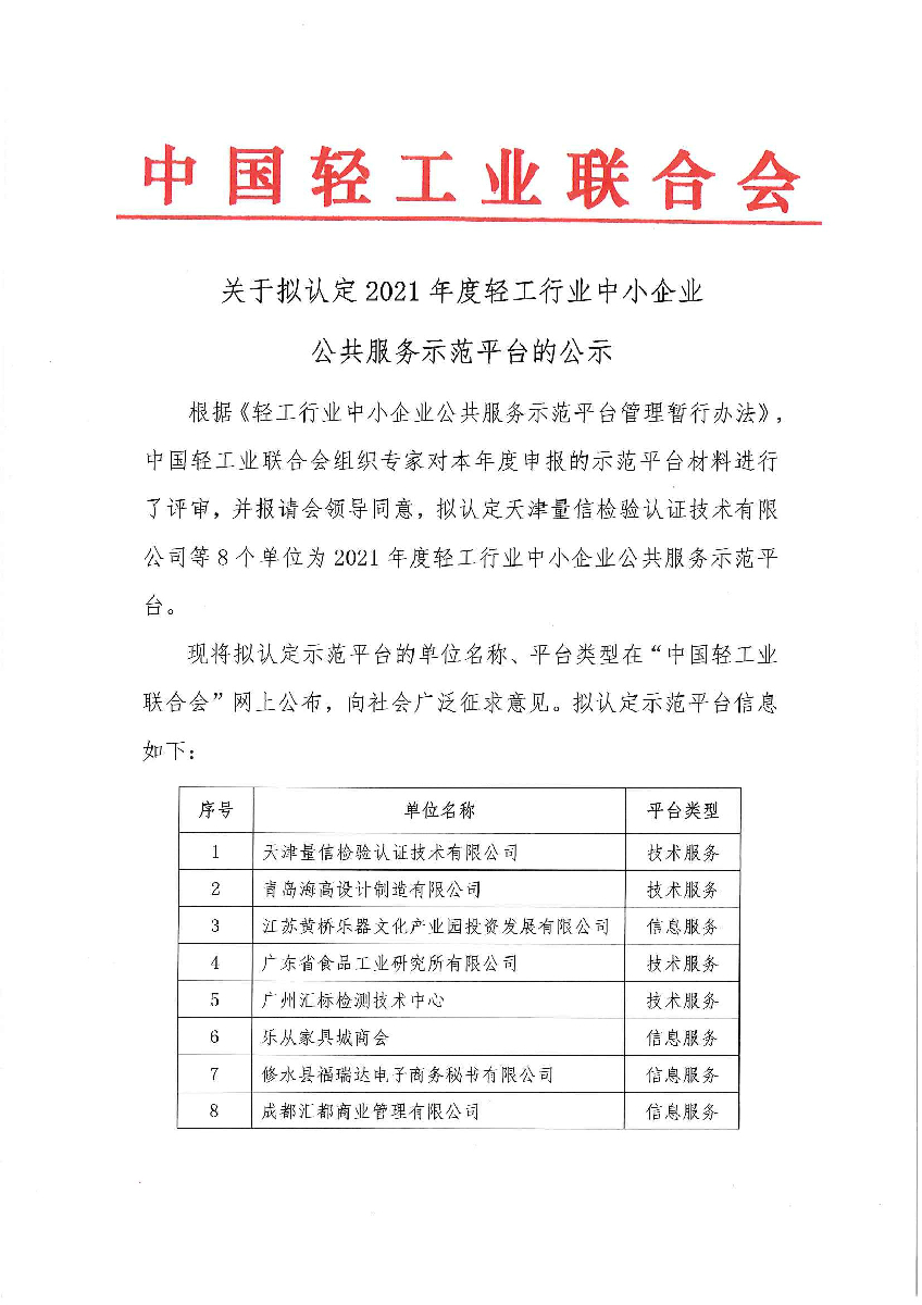 關(guān)于擬認(rèn)定2021年度輕工行業(yè)中小企業(yè)公共服務(wù)示范平臺(tái)的公示