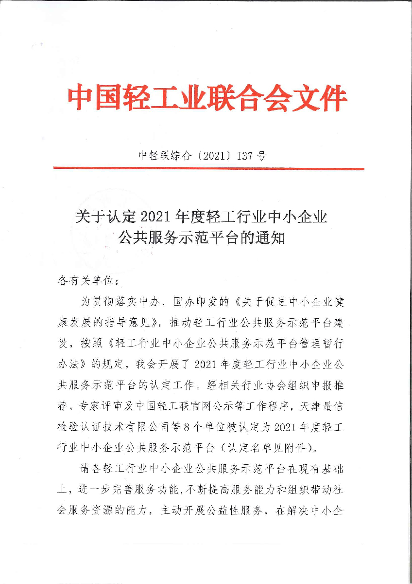 關于認定2021年度輕工行業(yè)中小企業(yè)公共服務示范平臺的通知