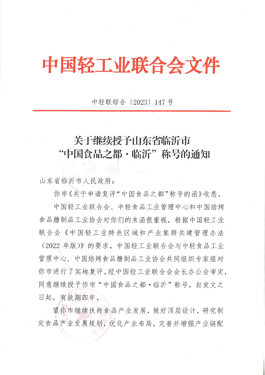 關于繼續(xù)授予山東省臨沂市“中國食品之都·臨沂”稱號的通知