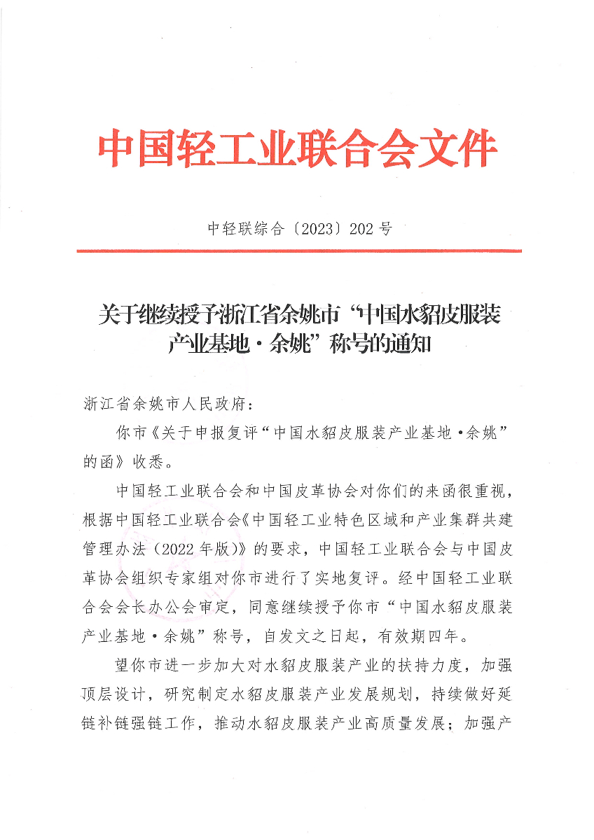 關(guān)于繼續(xù)授予浙江省余姚市“中國(guó)水貂皮服裝產(chǎn)業(yè)基地·余姚”稱號(hào)的通知