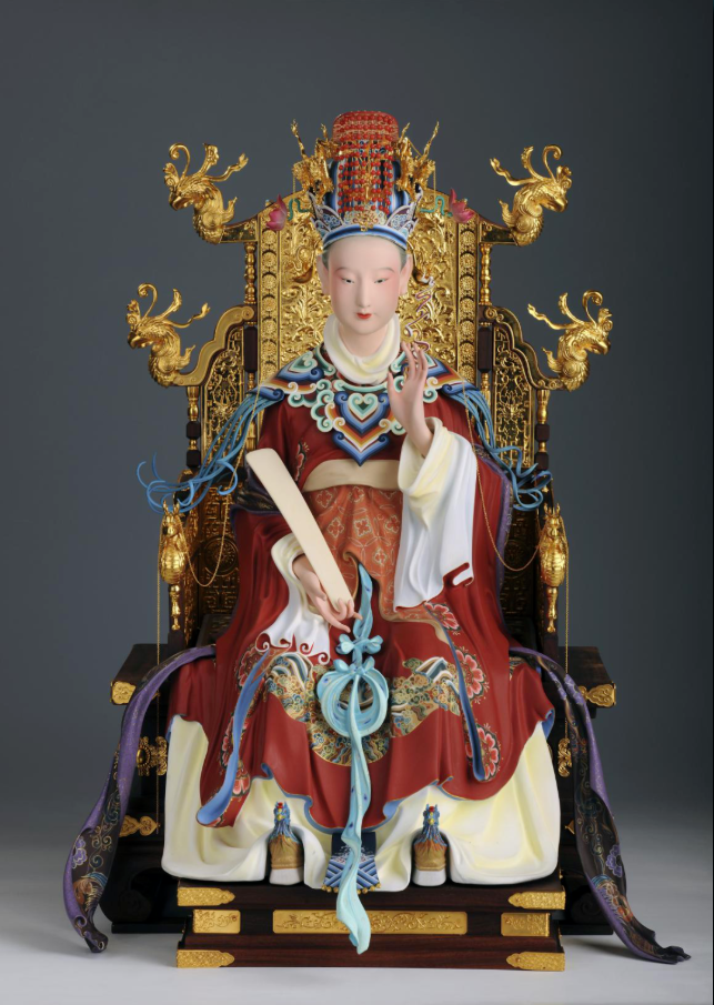 銀質(zhì)彩繪 高56厘米 媽祖文化是中華民族文化寶庫中重要的瑰寶,肇于宋,成于元,興于明,盛于清,繁榮于近現(xiàn)代。此座媽祖造像端莊典雅,面龐圓潤,端坐鸞椅之上,頭戴九旒冕冠,身著朱衣,云肩霞被。右手持如意,左手手指豎舉于胸前,指間有一縷裊裊云煙,象征著指引客商漁船的安全返航。