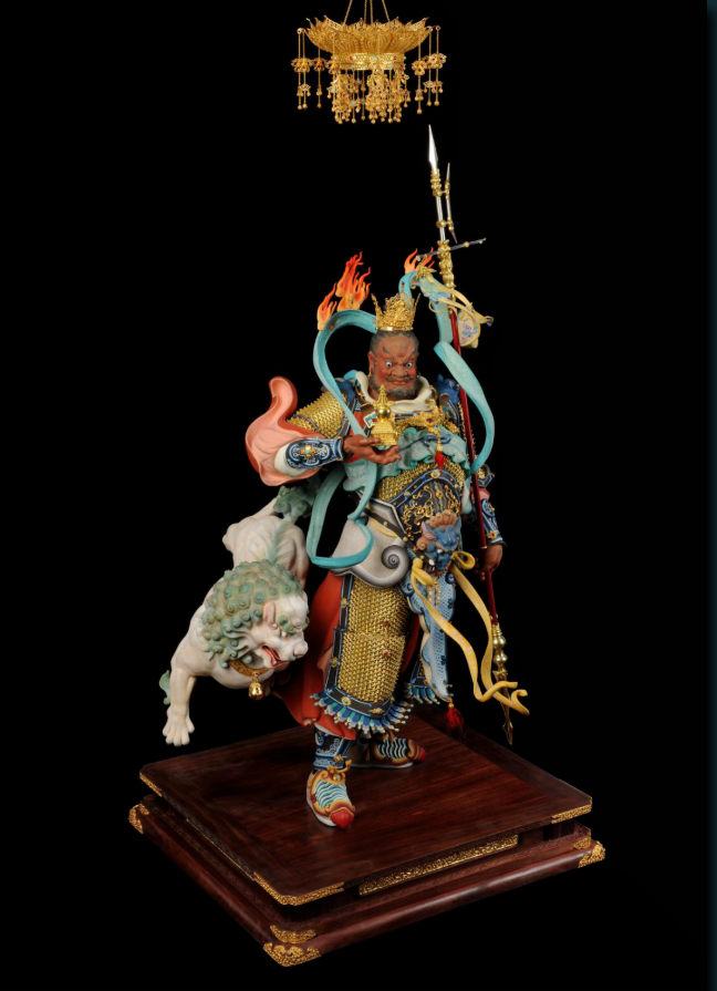 作品繼承了唐宋以來傳統(tǒng)彩塑技藝與藝術風格。此組造像中天王頭戴天冠,面色端嚴,身著金色鎧甲,內(nèi)襯天衣,左手執(zhí)戟,右擎寶塔,身后奔騰一咆哮綠鬃白獅,從天而降,威震八方,一派天將風范。