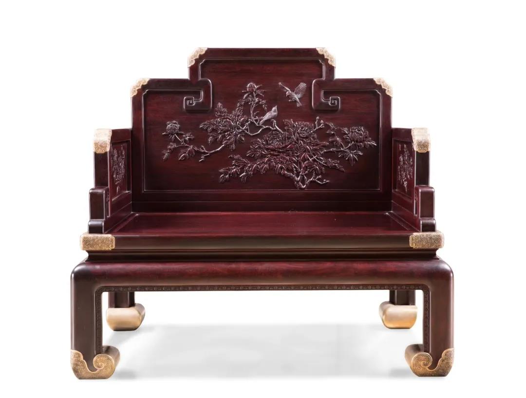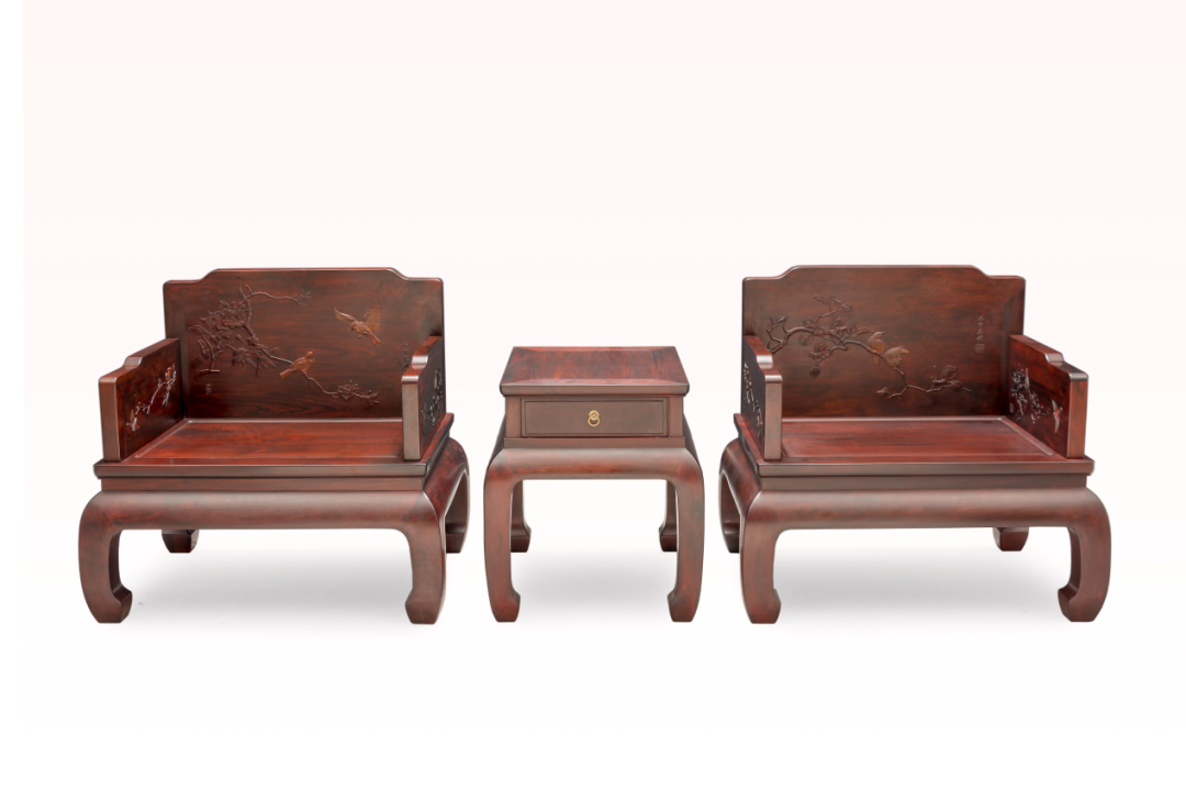 作品臻選交趾黃檀,精工打造而成。造型素雅清秀,勻稱協(xié)調(diào),挺拔秀麗;線條簡潔流暢,剛?cè)嵯酀?jì),質(zhì)樸大方??勘嘲搴妥笥覀?cè)板,淺浮雕工筆花鳥國畫,以刀代筆,收放自如,鳥雀栩栩如生,羽毛絲毫畢現(xiàn),形態(tài)逼真,躍然案上。座面攢框鑲心,落膛安腰,鼓腿彭牙,內(nèi)翻馬蹄。整件作品結(jié)構(gòu)嚴(yán)謹(jǐn),做工精細(xì),舒展穩(wěn)重,溫婉大氣。
