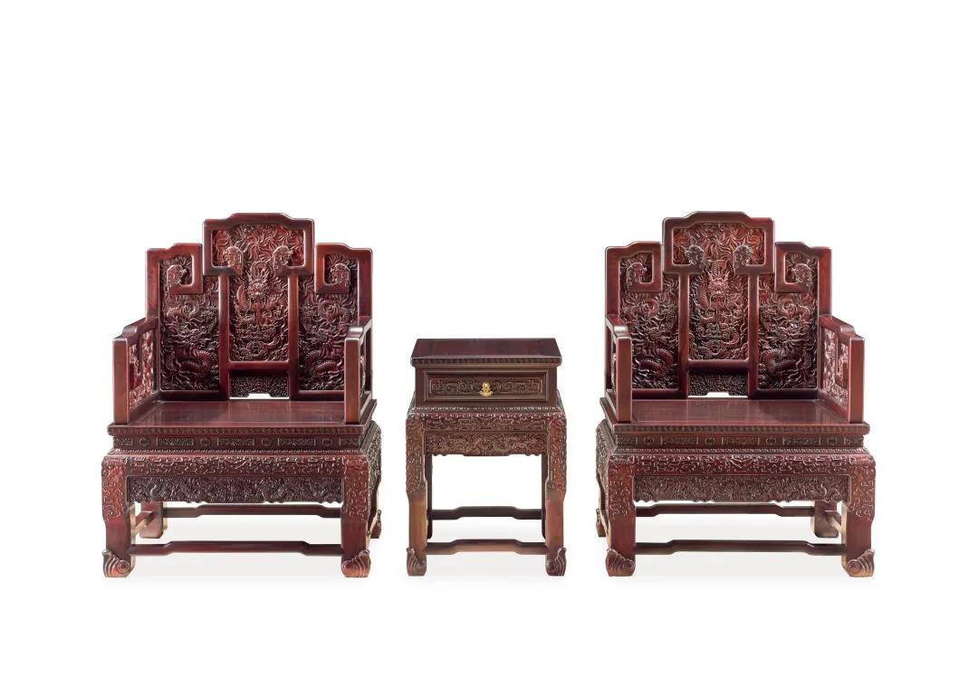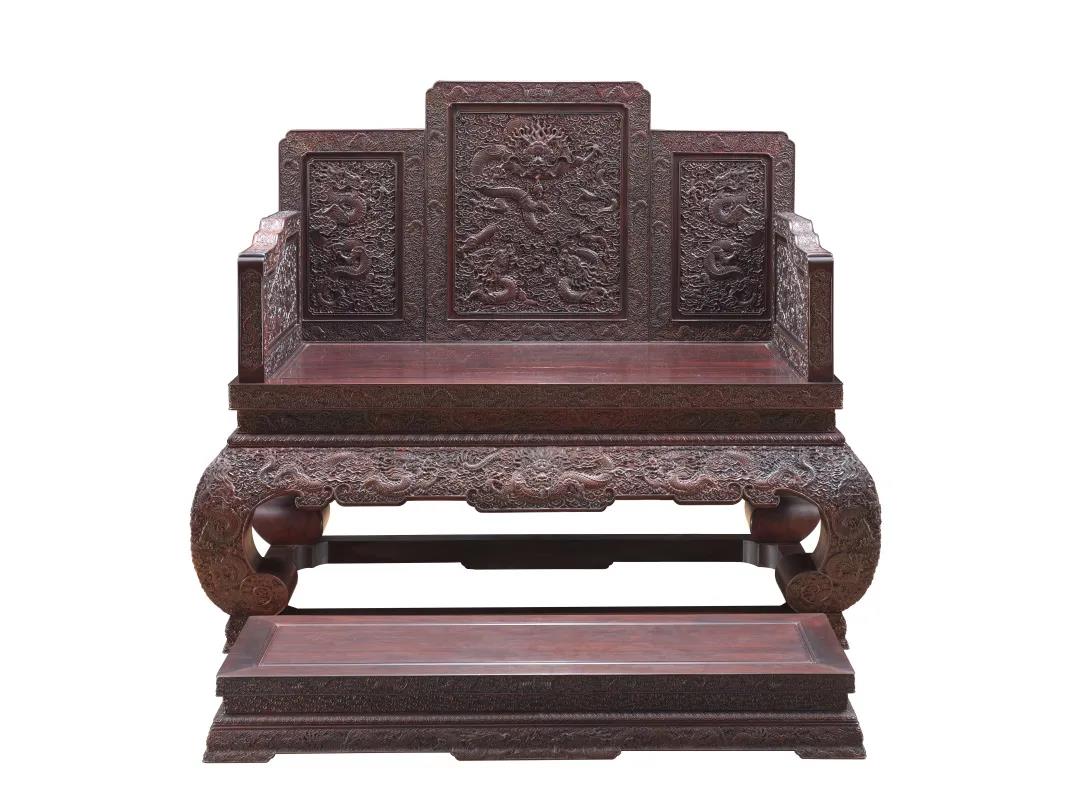 作品精選珍稀檀香紫檀,歷時(shí)一年多,精雕細(xì)琢而成。座圍七屏,梯狀分列,恢宏壯觀。雙面浮雕,深淺融合,工精藝巧。屏板滿雕云龍紋,構(gòu)思精巧,藏露得宜。雕工深入淺出,螭龍活靈活現(xiàn),昂首擺尾,出云入岫,披鱗騰日,栩栩如生。此寶座選材精良,雕工縝細(xì),富貴華麗,神韻飽滿,萬分雍容之姿,一派堂皇之氣,仿佛引人遁入皇宮大院,領(lǐng)略“君臨天下”豪邁場景。