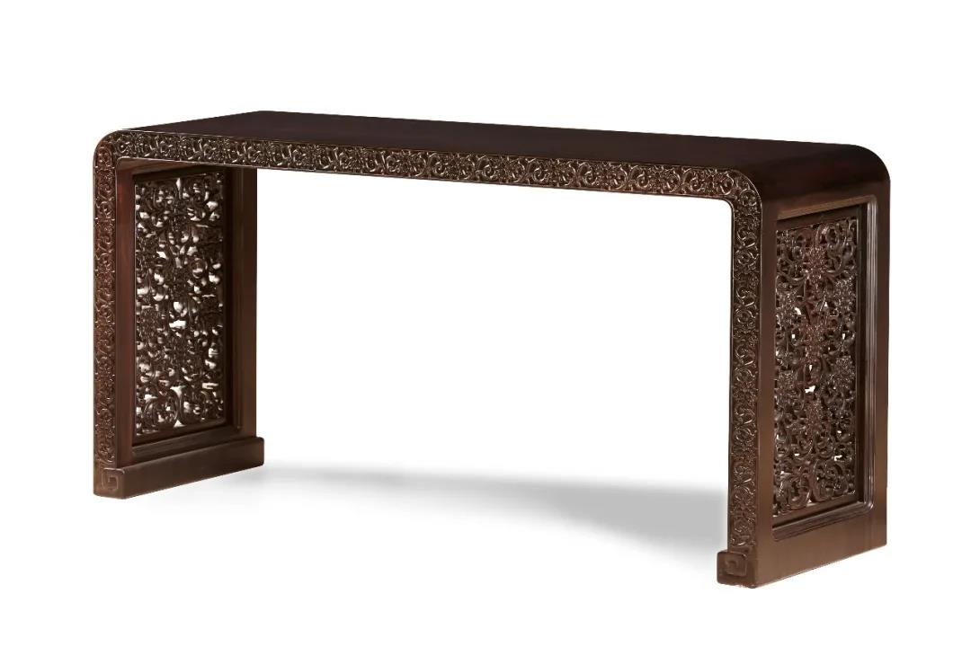 黃福華大師繼承了明清以來傳統(tǒng)的古典家具制作工藝,融合了現(xiàn)代藝術(shù)設(shè)計(jì)理念,不僅有傳統(tǒng)吉祥文化圖案,還與時(shí)俱進(jìn)融入時(shí)代元素,構(gòu)思巧妙,古韻今風(fēng)。黃大師集平雕、圓雕、浮雕、淺雕、陰雕、透雕等多種雕刻技法于一器,造型結(jié)構(gòu)簡練嚴(yán)謹(jǐn),形態(tài)雕飾含韻藏神,“型、材、藝、韻”和諧統(tǒng)一,形成了“制式獨(dú)特、連結(jié)巧妙、雕鏤細(xì)膩、意韻深厚”的藝術(shù)風(fēng)格。