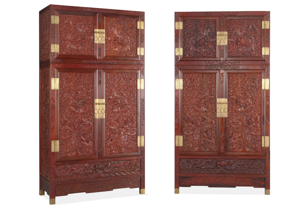 作品優(yōu)選交趾黃檀,形制高大,肅穆莊重,由頂柜和底柜組成,一左一右,成雙成對(duì)。正面及側(cè)面滿雕云龍,或?yàn)橄辇堮{云,九天騰日,昂首擺尾,出云入岫;或?yàn)殡p龍戲珠,威武雄壯,姿意翻滾,動(dòng)感十足。