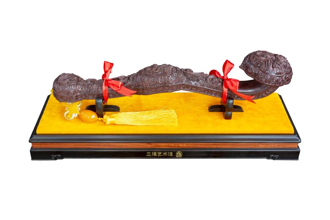 作品精選名貴木材印度小葉紫檀老料為材,工藝精湛,傳神生動(dòng)。如意首呈心形靈芝狀,體形弧曲圓渾,滿雕紋飾,神龍張口旋身,曲頸昂首騰躍于空,回首望鳳,翔鳳展翅翹尾,舉目眺龍,周圍瑞云朵朵,一派祥和之氣。寓意富貴吉祥、福氣安康、財(cái)運(yùn)連綿、節(jié)節(jié)高升。