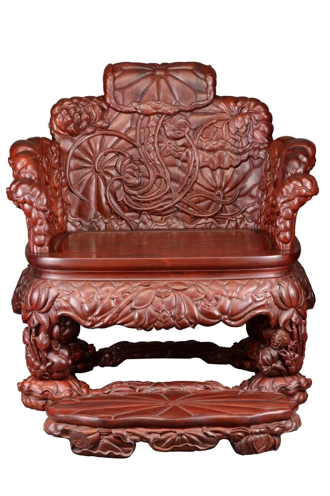 作品臻選大葉紫檀,整體以荷為形,人坐其上,仿入荷塘?;ㄈ~翩躚,具裝飾性;水波瀲艷,富藝術(shù)美。束腰帶托泥,滿雕荷花圖;圍子分三扇,化作七屏風(fēng)。座面以外,滿身浮雕,深淺融合,工精藝巧。背板花葉穿插變化,構(gòu)思精巧,藏露得宜,雕工深入淺出,流暢圓渾。