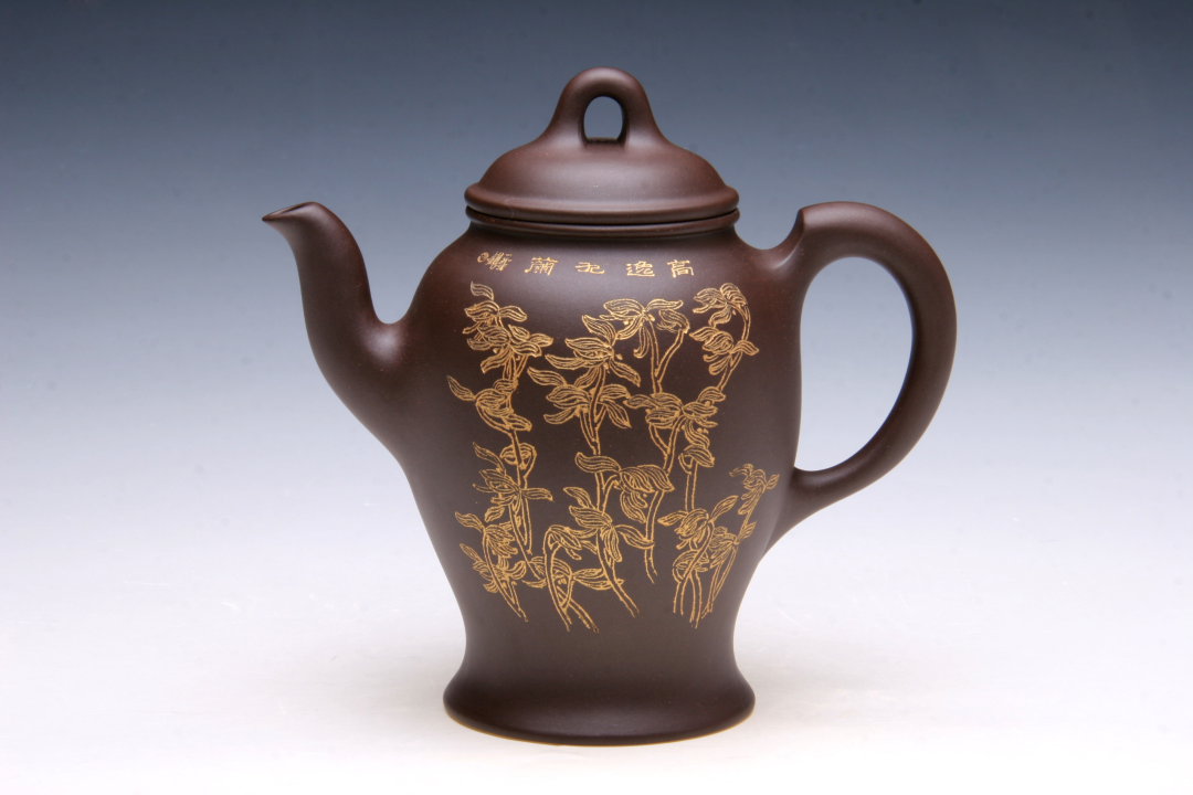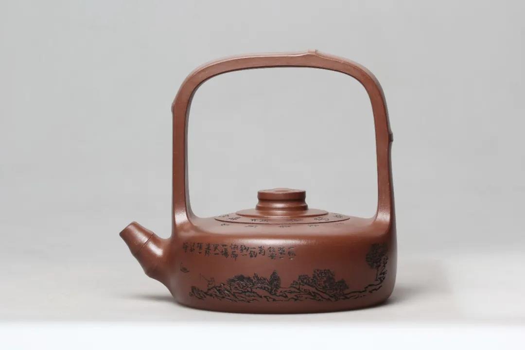 竹,有著不一般的中國傳統(tǒng)文化含義,四季常青寓頑強(qiáng)生命,內(nèi)心中空寓虛懷若谷,彎而不折寓柔中有剛,生而有節(jié)、竹節(jié)必露寓高風(fēng)亮節(jié)。壺型和壺名絲絲入扣,壺型融入竹之精神,渾然一體。壺身正面刻繪山水,壺蓋裝飾以鐘鼎文,集中國書法繪畫之大成,刻繪鐵劃銀鉤,凝練古樸,神韻怡然,與“竹露生香”造型相映生輝。